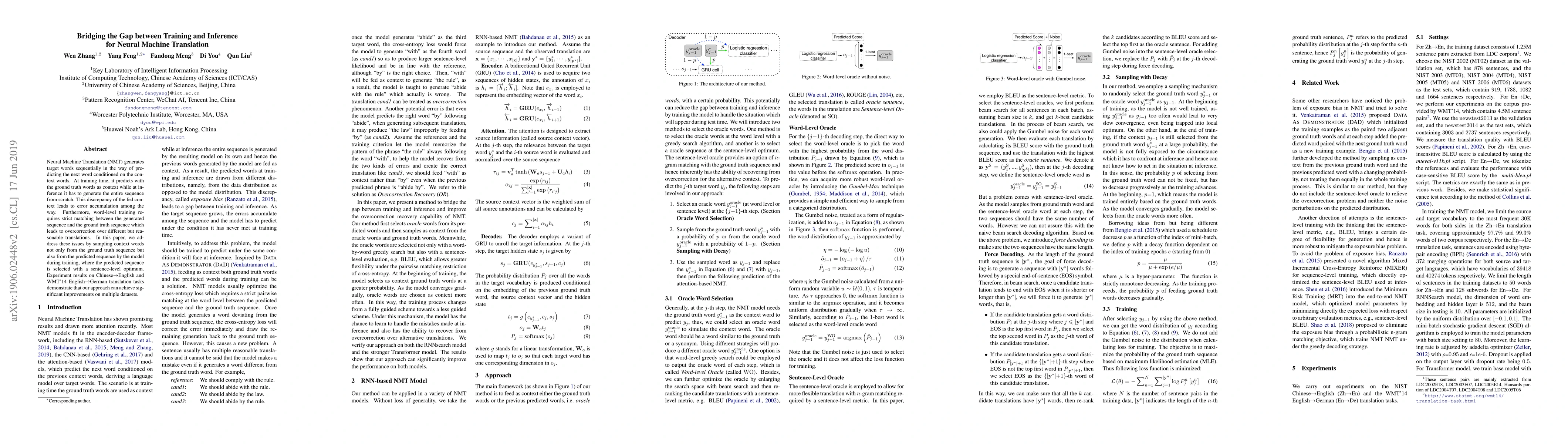 This paper proposes a method to bridge the gap between training and inference in Neural Machine Translation by sampling context words from both the ground truth and predicted sequences during training. This approach aims to reduce error accumulation and overcorrection, leading to significant improvements in translation accuracy on Chinese->English and WMT'14 English->German datasets.