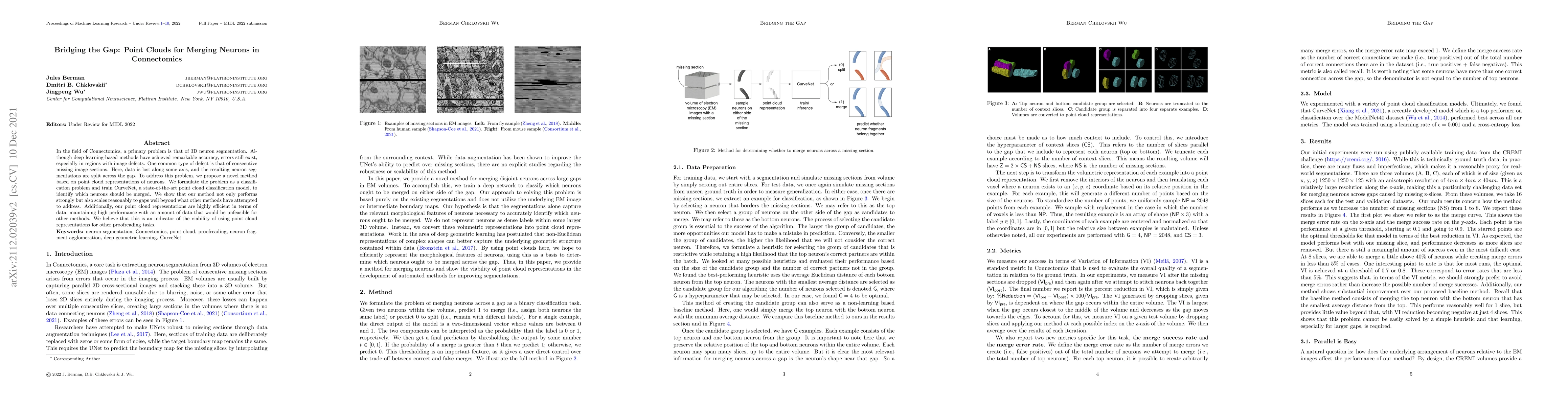 In the field of Connectomics, a primary problem is that of 3D neuron segmentation. Although deep learning-based methods have achieved remarkable accuracy, errors still exist, especially in regions with image defects. One common type of defect is that of consecutive missing image sections. Here, data is lost along some axis, and the resulting neuron segmentations are split across the gap. To address this problem, we propose a novel method based on point cloud representations of neurons. We formulate the problem as a classification problem and train CurveNet, a state-of-the-art point cloud classification model, to identify which neurons should be merged. We show that our method not only performs strongly but also scales reasonably to gaps well beyond what other methods have attempted to address. Additionally, our point cloud representations are highly efficient in terms of data, maintaining high performance with an amount of data that would be unfeasible for other methods. We believe that this is an indicator of the viability of using point cloud representations for other proofreading tasks.