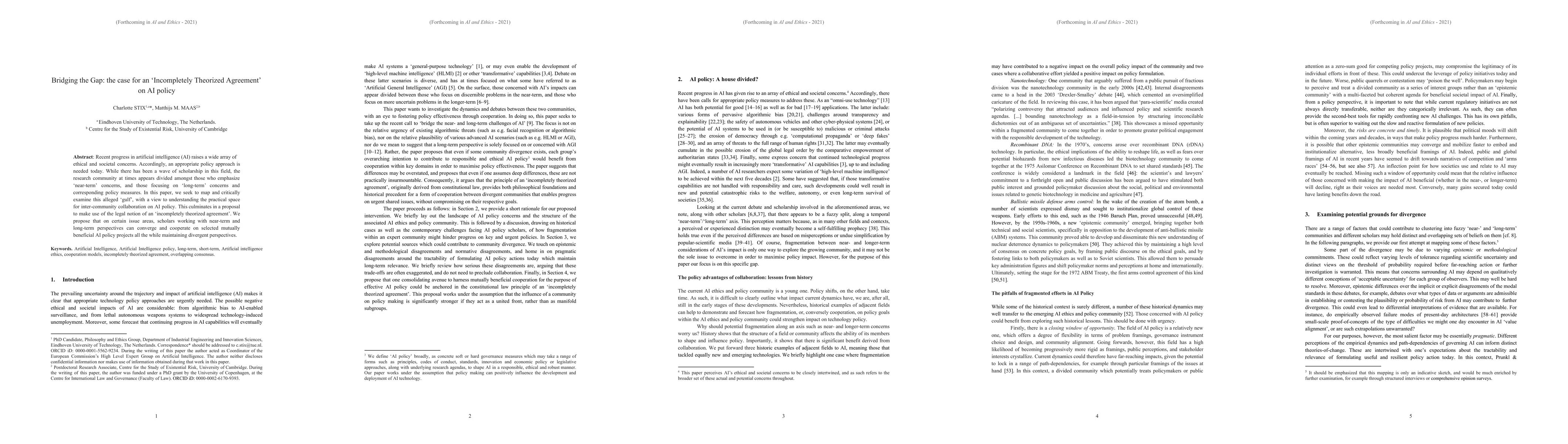 This paper proposes a way to bridge the gap between scholars focusing on near-term and long-term concerns about AI policy through an incompletely theorized agreement, enabling collaboration on mutually beneficial projects while maintaining divergent perspectives.