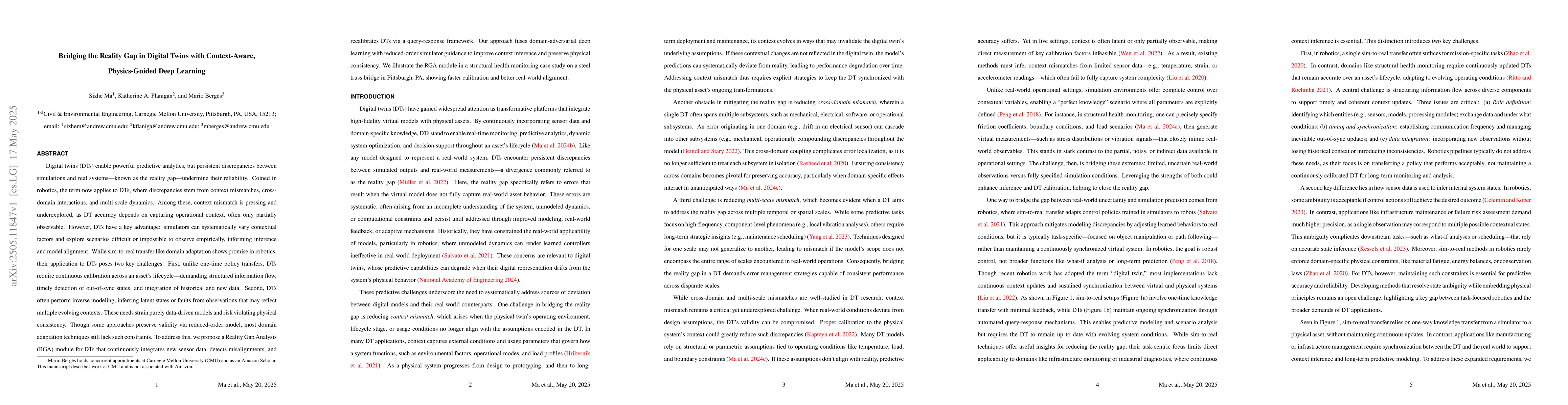 This research is important as it enhances the reliability of Digital Twins by bridging the reality gap, which is crucial for their application in various industries such as infrastructure, manufacturing, and healthcare. By improving context inference and preserving physical consistency, it enables more accurate predictive analytics.