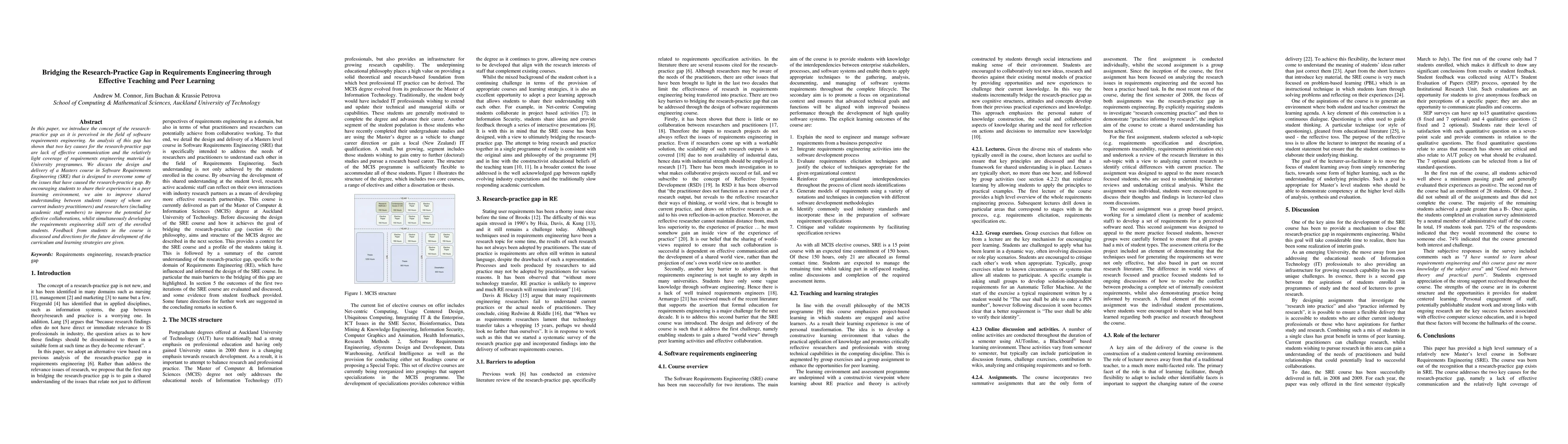 This paper addresses the research-practice gap in software requirements engineering, attributing it to ineffective communication and insufficient university coverage. It proposes a Masters course designed to bridge this gap through effective teaching and peer learning, aiming to enhance collaboration and improve students' skills.