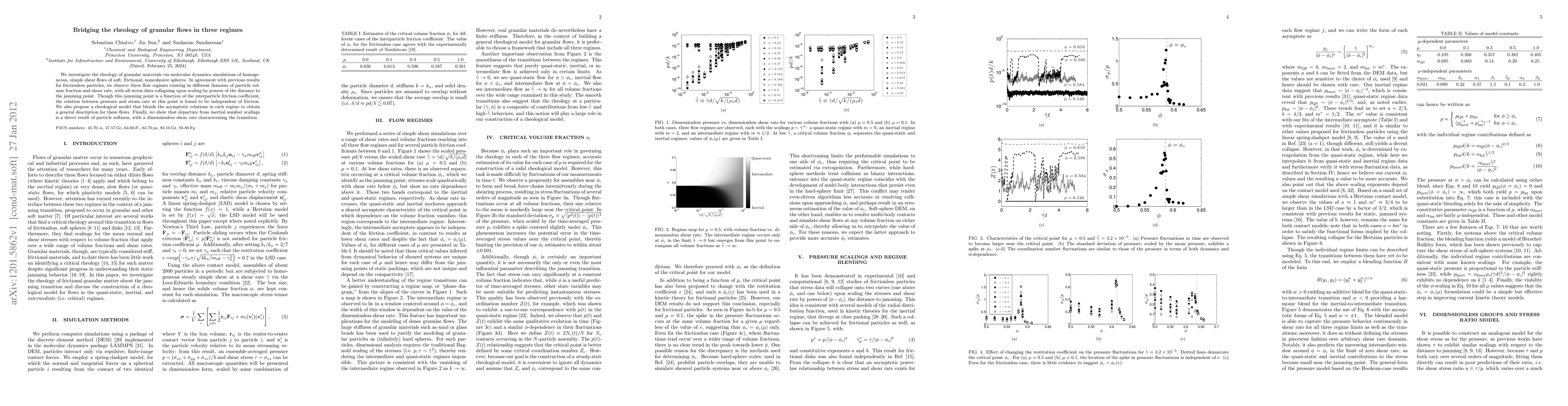 This paper investigates the rheology of granular materials through molecular dynamics simulations, identifying three distinct flow regimes based on particle volume fraction and shear rate. A proposed rheological model effectively describes these regimes, and the study finds that particle softness influences the transition from inertial number scalings.