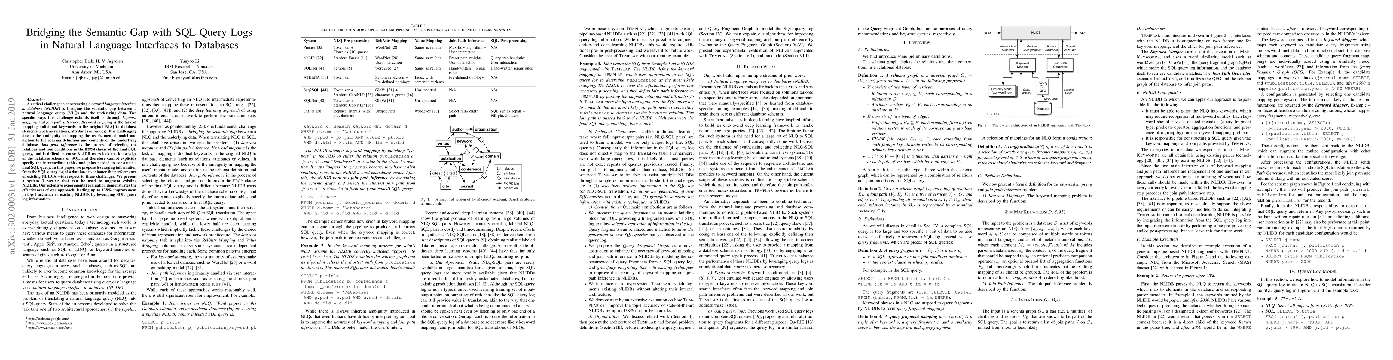 This paper proposes a method to bridge the semantic gap in natural language interfaces to databases by leveraging SQL query logs to improve keyword mapping and join path inference. The system Templar enhances existing natural language interfaces, achieving up to a 138% improvement in top-1 accuracy through this approach.