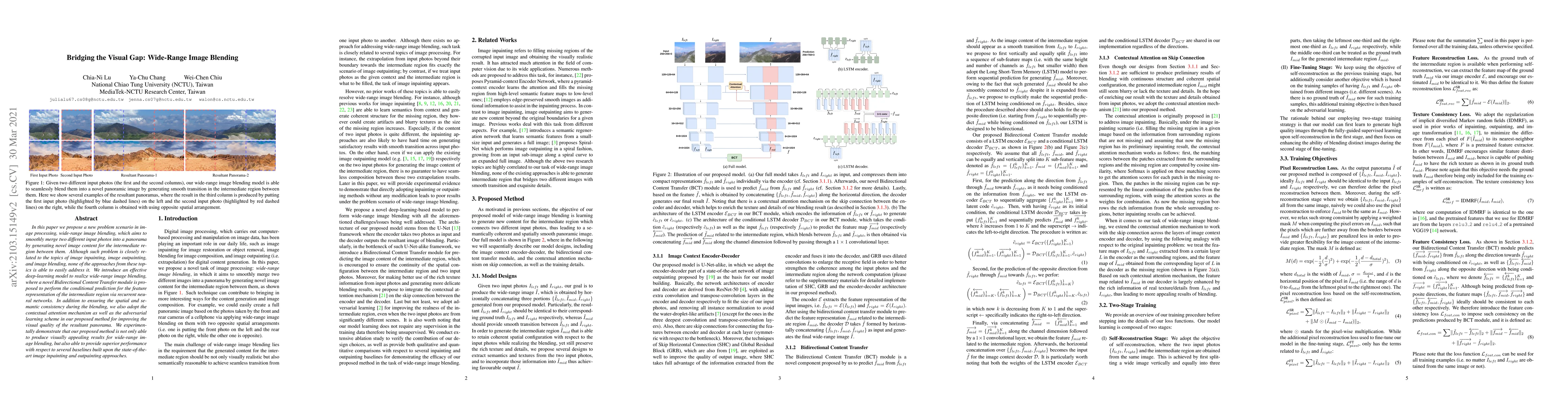 A new deep-learning model is proposed for wide-range image blending, which can generate novel content for intermediate regions between two input photos to create a seamless panorama. The method achieves superior performance compared to existing state-of-the-art approaches in image inpainting and outpainting.
