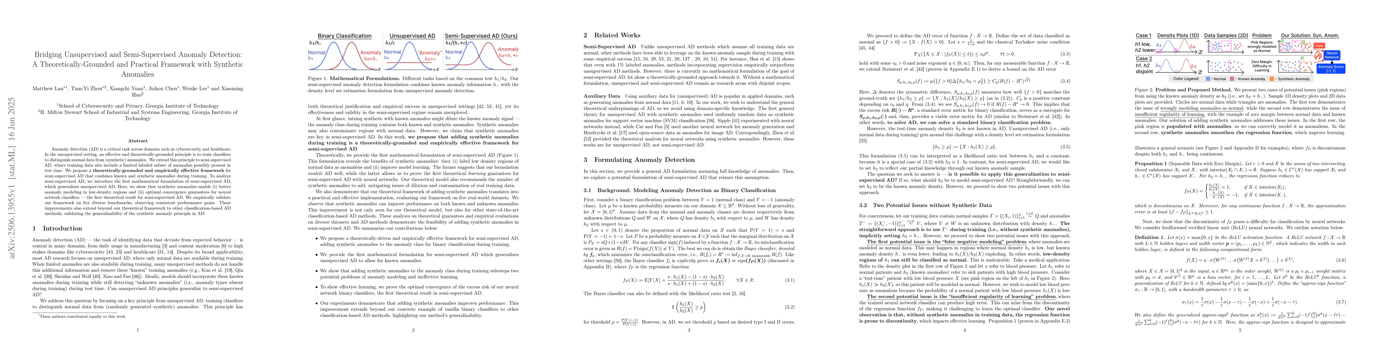 Anomaly detection (AD) is a critical task across domains such as cybersecurity and healthcare. In the unsupervised setting, an effective and theoretically-grounded principle is to train classifiers to distinguish normal data from (synthetic) anomalies. We extend this principle to semi-supervised AD, where training data also include a limited labeled subset of anomalies possibly present in test time. We propose a theoretically-grounded and empirically effective framework for semi-supervised AD that combines known and synthetic anomalies during training. To analyze semi-supervised AD, we introduce the first mathematical formulation of semi-supervised AD, which generalizes unsupervised AD. Here, we show that synthetic anomalies enable (i) better anomaly modeling in low-density regions and (ii) optimal convergence guarantees for neural network classifiers -- the first theoretical result for semi-supervised AD. We empirically validate our framework on five diverse benchmarks, observing consistent performance gains. These improvements also extend beyond our theoretical framework to other classification-based AD methods, validating the generalizability of the synthetic anomaly principle in AD.