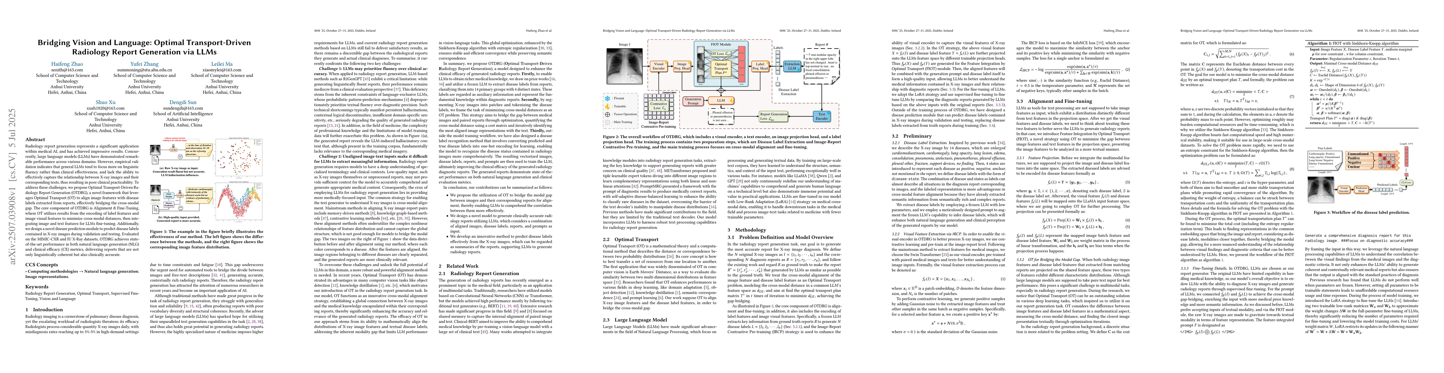Radiology report generation represents a significant application within medical AI, and has achieved impressive results. Concurrently, large language models (LLMs) have demonstrated remarkable performance across various domains. However, empirical validation indicates that general LLMs tend to focus more on linguistic fluency rather than clinical effectiveness, and lack the ability to effectively capture the relationship between X-ray images and their corresponding texts, thus resulting in poor clinical practicability. To address these challenges, we propose Optimal Transport-Driven Radiology Report Generation (OTDRG), a novel framework that leverages Optimal Transport (OT) to align image features with disease labels extracted from reports, effectively bridging the cross-modal gap. The core component of OTDRG is Alignment \& Fine-Tuning, where OT utilizes results from the encoding of label features and image visual features to minimize cross-modal distances, then integrating image and text features for LLMs fine-tuning. Additionally, we design a novel disease prediction module to predict disease labels contained in X-ray images during validation and testing. Evaluated on the MIMIC-CXR and IU X-Ray datasets, OTDRG achieves state-of-the-art performance in both natural language generation (NLG) and clinical efficacy (CE) metrics, delivering reports that are not only linguistically coherent but also clinically accurate.