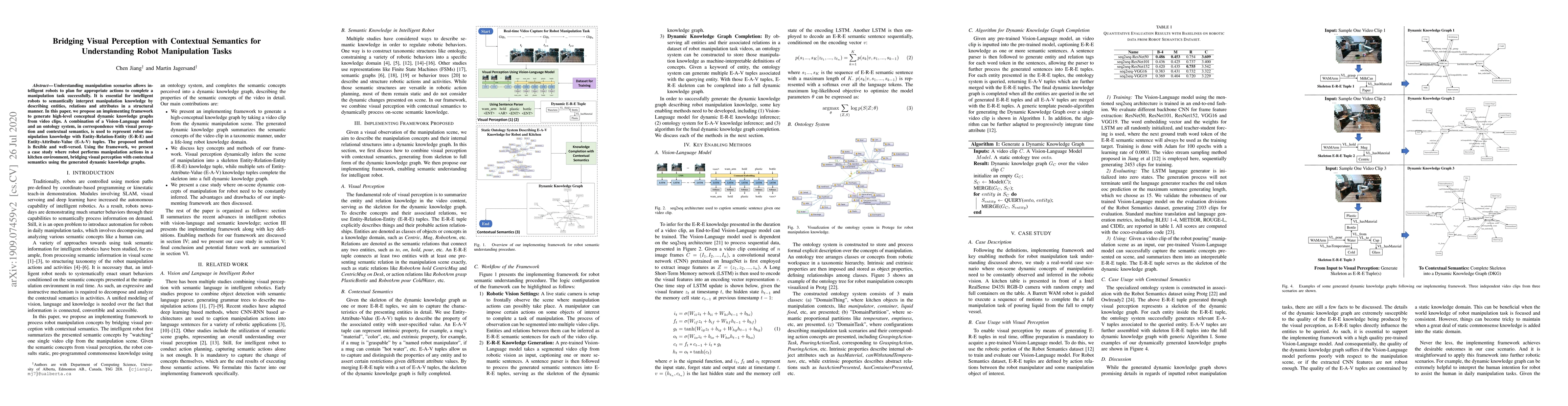Understanding manipulation scenarios allows intelligent robots to plan for appropriate actions to complete a manipulation task successfully. It is essential for intelligent robots to semantically interpret manipulation knowledge by describing entities, relations and attributes in a structural manner. In this paper, we propose an implementing framework to generate high-level conceptual dynamic knowledge graphs from video clips. A combination of a Vision-Language model and an ontology system, in correspondence with visual perception and contextual semantics, is used to represent robot manipulation knowledge with Entity-Relation-Entity (E-R-E) and Entity-Attribute-Value (E-A-V) tuples. The proposed method is flexible and well-versed. Using the framework, we present a case study where robot performs manipulation actions in a kitchen environment, bridging visual perception with contextual semantics using the generated dynamic knowledge graphs.