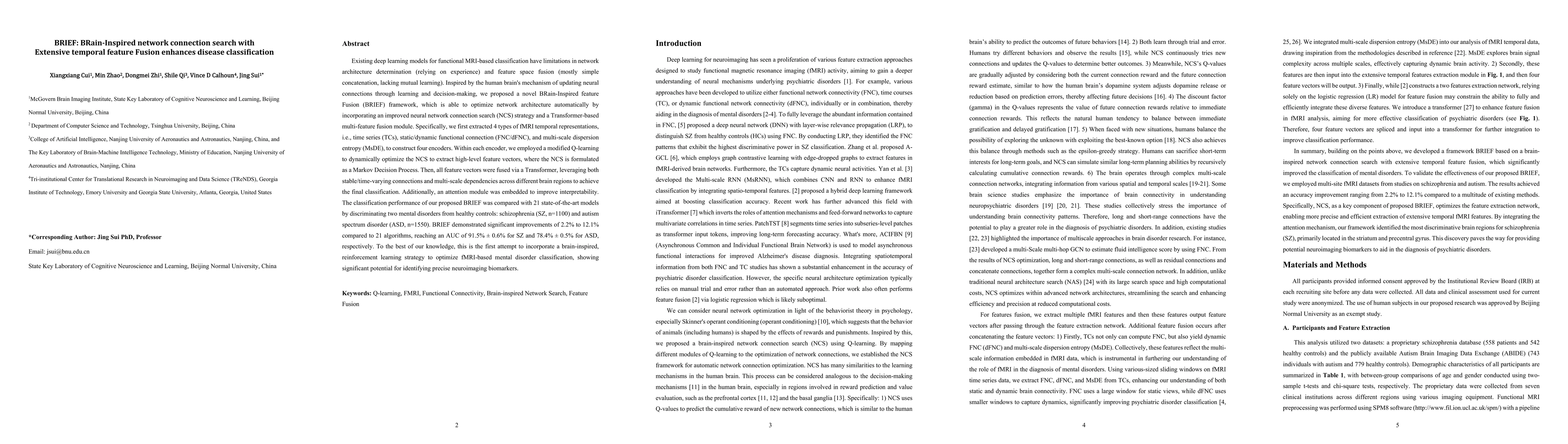 Existing deep learning models for functional MRI-based classification have limitations in network architecture determination (relying on experience) and feature space fusion (mostly simple concatenation, lacking mutual learning). Inspired by the human brain's mechanism of updating neural connections through learning and decision-making, we proposed a novel BRain-Inspired feature Fusion (BRIEF) framework, which is able to optimize network architecture automatically by incorporating an improved neural network connection search (NCS) strategy and a Transformer-based multi-feature fusion module. Specifically, we first extracted 4 types of fMRI temporal representations, i.e., time series (TCs), static/dynamic functional connection (FNC/dFNC), and multi-scale dispersion entropy (MsDE), to construct four encoders. Within each encoder, we employed a modified Q-learning to dynamically optimize the NCS to extract high-level feature vectors, where the NCS is formulated as a Markov Decision Process. Then, all feature vectors were fused via a Transformer, leveraging both stable/time-varying connections and multi-scale dependencies across different brain regions to achieve the final classification. Additionally, an attention module was embedded to improve interpretability. The classification performance of our proposed BRIEF was compared with 21 state-of-the-art models by discriminating two mental disorders from healthy controls: schizophrenia (SZ, n=1100) and autism spectrum disorder (ASD, n=1550). BRIEF demonstrated significant improvements of 2.2% to 12.1% compared to 21 algorithms, reaching an AUC of 91.5% - 0.6% for SZ and 78.4% - 0.5% for ASD, respectively. This is the first attempt to incorporate a brain-inspired, reinforcement learning strategy to optimize fMRI-based mental disorder classification, showing significant potential for identifying precise neuroimaging biomarkers.