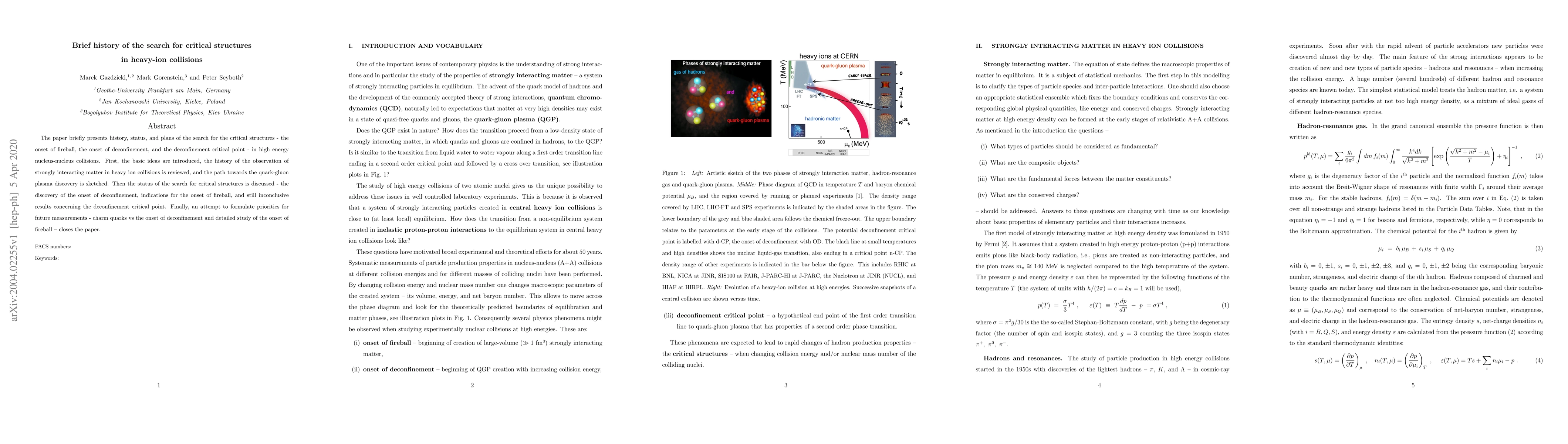 The paper briefly presents history, status, and plans of the search for the critical structures - the onset of fireball, the onset of deconfinement, and the deconfinement critical point - in high energy nucleus-nucleus collisions. First, the basic ideas are introduced, the history of the observation of strongly interacting matter in heavy ion collisions is reviewed, and the path towards the quark-gluon plasma discovery is sketched. Then the status of the search for critical structures is discussed - the discovery of the onset of deconfinement, indications for the onset of fireball, and still inconclusive results concerning the deconfinement critical point. Finally, an attempt to formulate priorities for future measurements - charm quarks vs the onset of deconfinement and detailed study of the onset of fireball - closes the paper.