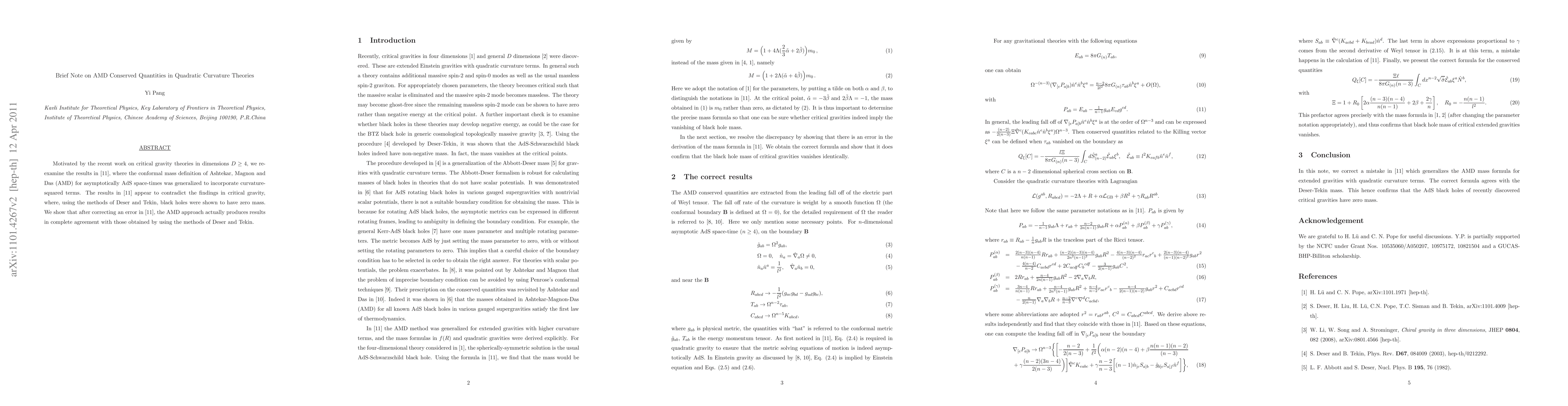 This paper corrects an error in the AMD conserved quantities definition for quadratic curvature theories in asymptotically AdS space-times and demonstrates that, after the correction, the results align with those from critical gravity, confirming that black holes indeed have zero mass.