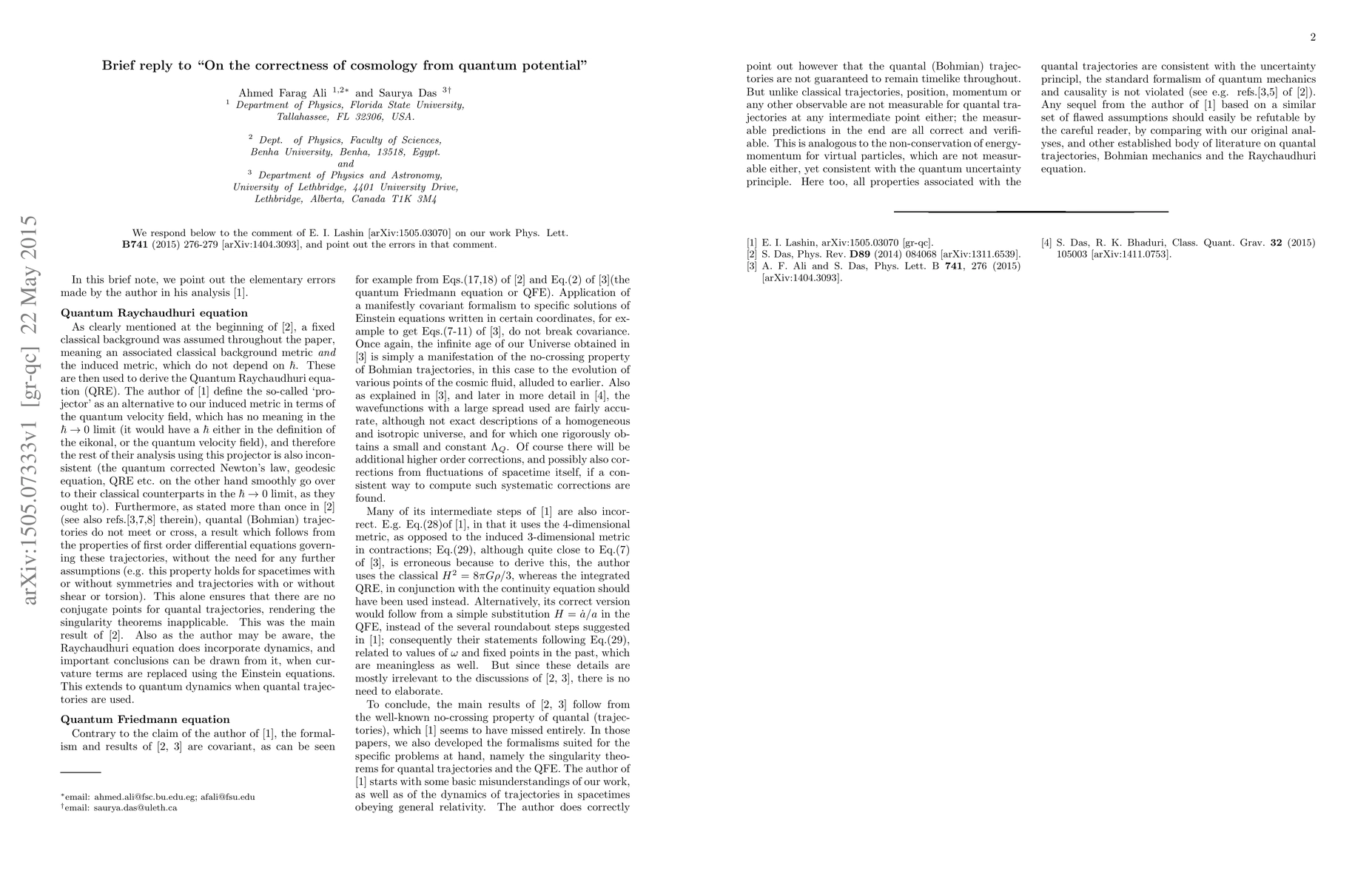 We respond below to the comment of E. I. Lashin [ arXiv:1505.03070 ] on our work Phys. Lett. {\bf B741} (2015) 276-279 [ arXiv:1404.3093 ], and point out the errors in that comment.