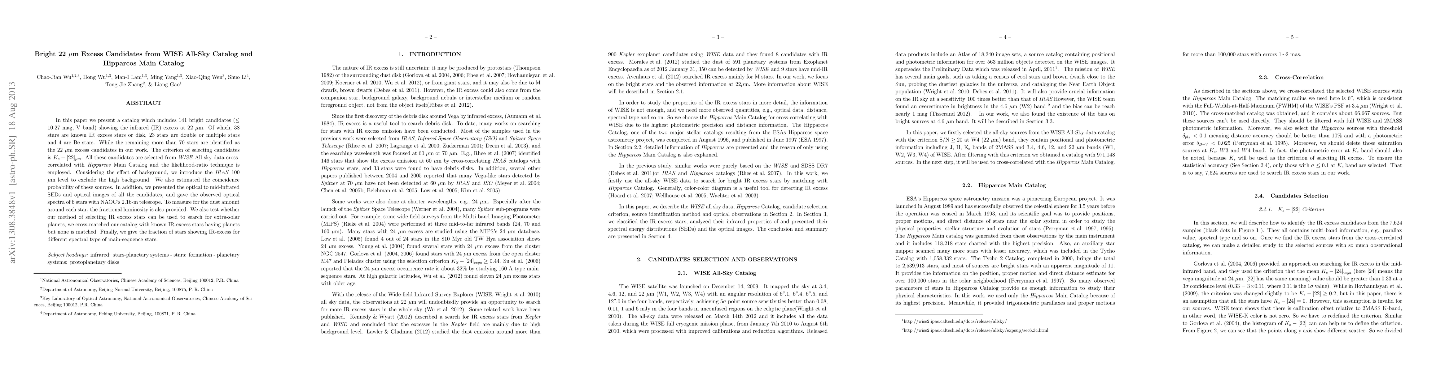 In this paper we present a catalog which includes 141 bright candidates ($\leq10.27$ mag, V band) showing the infrared (IR) excess at 22 $\mu$m. Of which, 38 stars are known IR excess stars or disk, 23 stars are double or multiple stars and 4 are Be stars. While the remaining more than 70 stars are identified as the 22 $\mu$m excess candidates in our work. The criterion of selecting candidates is $K_s-[22]_{\mu m}$. All these candidates are selected from \emph{WISE} All-sky data cross-correlated with \emph{Hipparcos} Main Catalog and the likelihood-ratio technique is employed. Considering the effect of background, we introduce the \emph{IRAS} 100 $\mu$m level to exclude the high background. We also estimated the coincidence probability of these sources. In addition, we presented the optical to mid-infrared SEDs and optical images of all the candidates, and gave the observed optical spectra of 6 stars with NAOC's 2.16-m telescope. To measure for the dust amount around each star, the fractional luminosity is also provided. We also test whether our method of selecting IR excess stars can be used to search for extra-solar planets, we cross-matched our catalog with known IR-excess stars having planets but none is matched. Finally, we give the fraction of stars showing IR-excess for different spectral type of main-sequence stars.