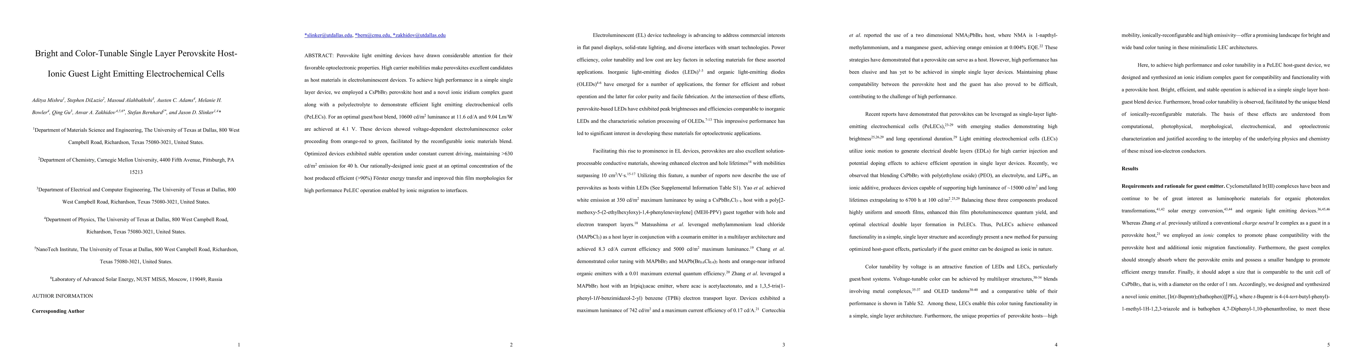 This paper presents a single-layer perovskite host-ionic guest light emitting electrochemical cell (PeLEC) using CsPbBr3 and an ionic iridium complex, achieving high luminance and tunable color from orange-red to green. The device demonstrates stable operation and efficient energy transfer, facilitated by the ionic blend.