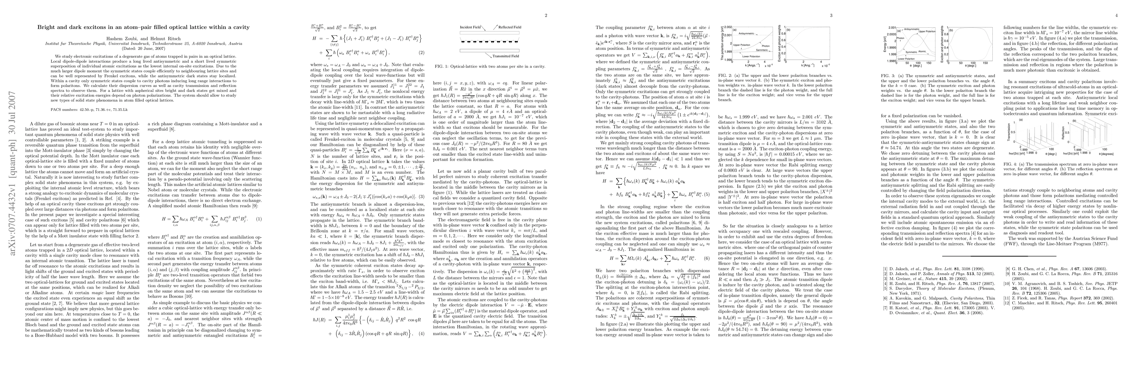 We study electronic excitations of a degenerate gas of atoms trapped in pairs in an optical lattice. Local dipole-dipole interactions produce a long lived antisymmetric and a short lived symmetric superposition of individual atomic excitations as the lowest internal on-site excitations. Due to the much larger dipole moment the symmetric states couple efficiently to neighbouring lattice sites and can be well represented by Frenkel excitons, while the antisymmetric dark states stay localized. Within a cavity only symmetric states couple to cavity photons inducing long range interactions to form polaritons. We calculate their dispersion curves as well as cavity transmission and reflection spectra to observe them. For a lattice with aspherical sites bright and dark states get mixed and their relative excitation energies depend on photon polarizations. The system should allow to study new types of solid state phenomena in atom filled optical lattices.