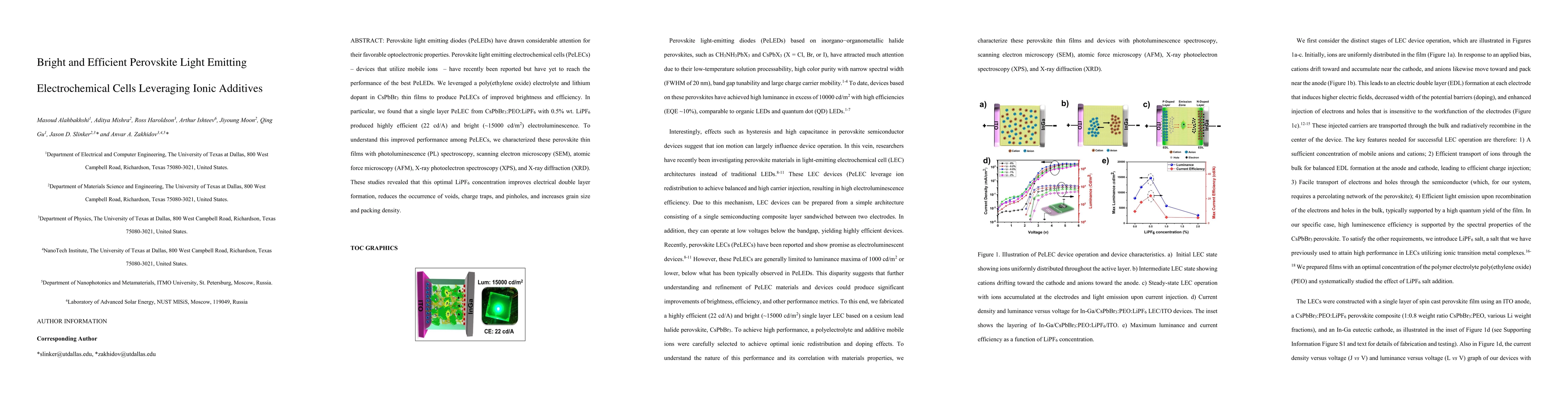 This study enhances the brightness and efficiency of perovskite light-emitting electrochemical cells (PeLECs) using ionic additives, achieving a highly efficient device with 22 cd/A and ~15000 cd/m² electroluminescence. The optimal performance is attributed to improved electrical double layer formation and reduced defects.