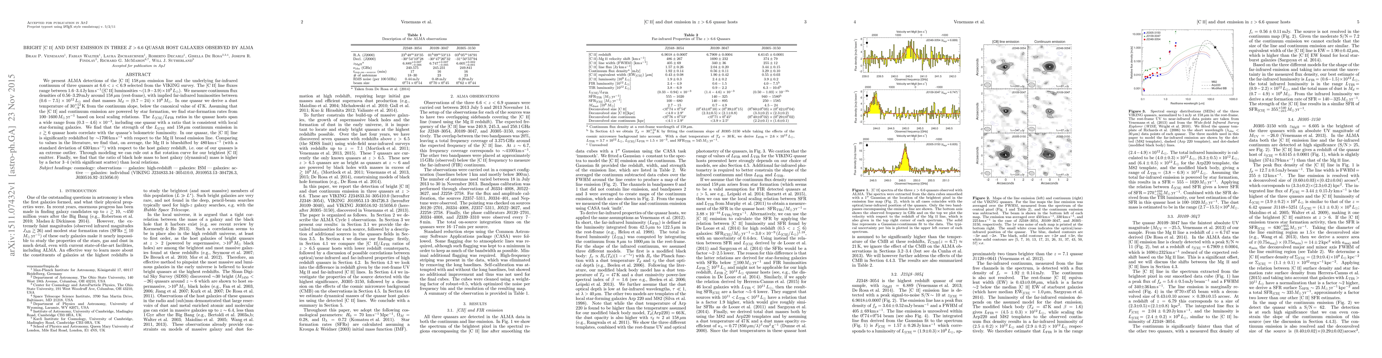 This paper reports ALMA observations of [CII] emission and dust continuum in three high-redshift quasar host galaxies, revealing star-formation rates up to 1600 M_sun/yr and a correlation between [CII] emission and quasar luminosity. One quasar shows an unusually redshifted [CII] line.