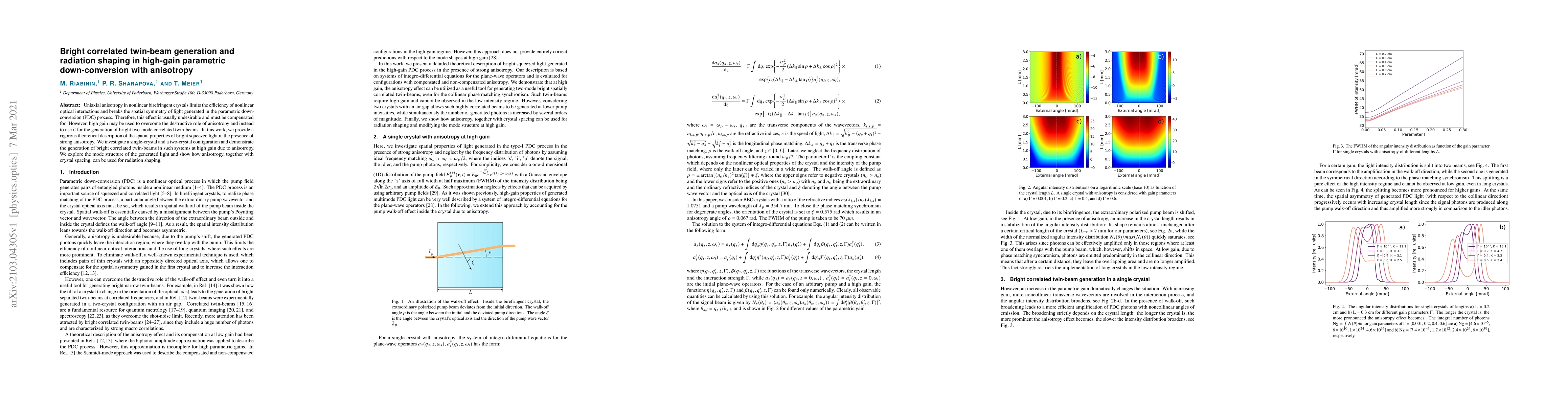 This paper presents a theoretical framework for generating bright correlated twin-beams in high-gain parametric down-conversion using uniaxial anisotropy, overcoming its usual detrimental effects. It explores both single-crystal and two-crystal configurations, demonstrating how anisotropy can be leveraged for radiation shaping.