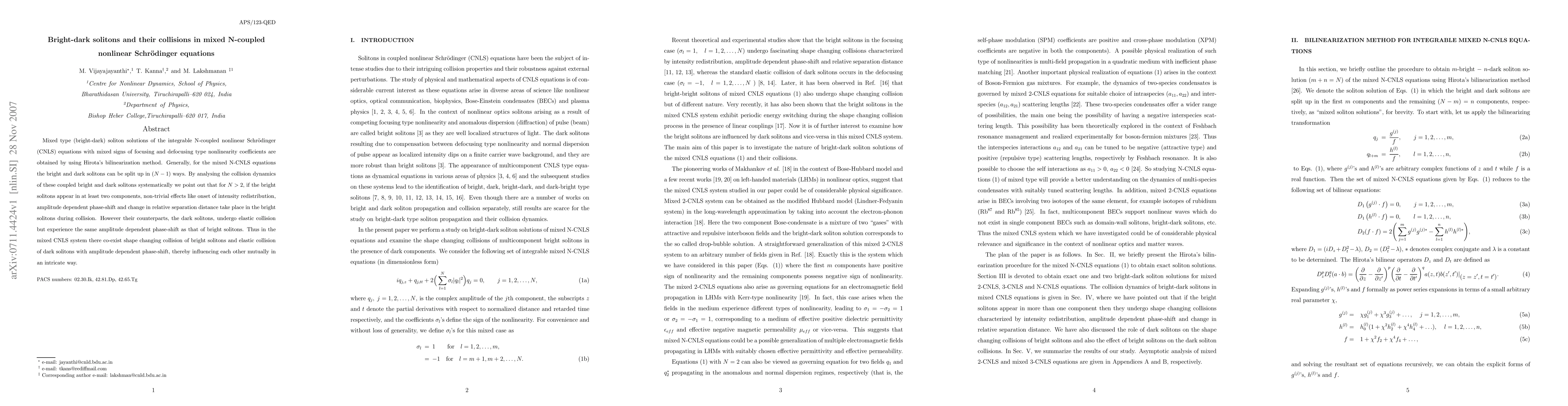This paper investigates mixed bright-dark soliton solutions in N-coupled nonlinear Schrödinger equations using Hirota's method, revealing complex collision dynamics where bright solitons undergo shape changes and dark solitons collide elastically, both experiencing amplitude-dependent phase shifts.