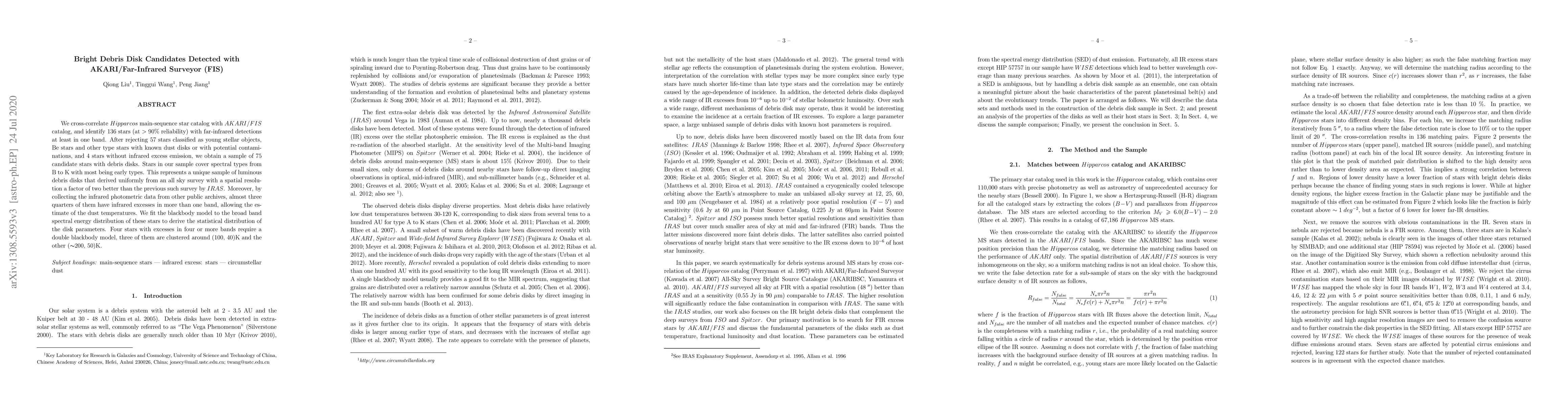 This study identifies 83 candidate stars with debris disks from a cross-correlation of the hip main-sequence star catalog with the akari Far-Infrared Surveyor (FIS) catalog. With improved spatial resolution compared to previous surveys, 85% of these stars show infrared excesses in multiple bands, enabling dust temperature estimates. The research reveals a substantial fraction (58 stars) have weak 12 micron excess, suggesting a common warm dust component in these bright debris disk systems.