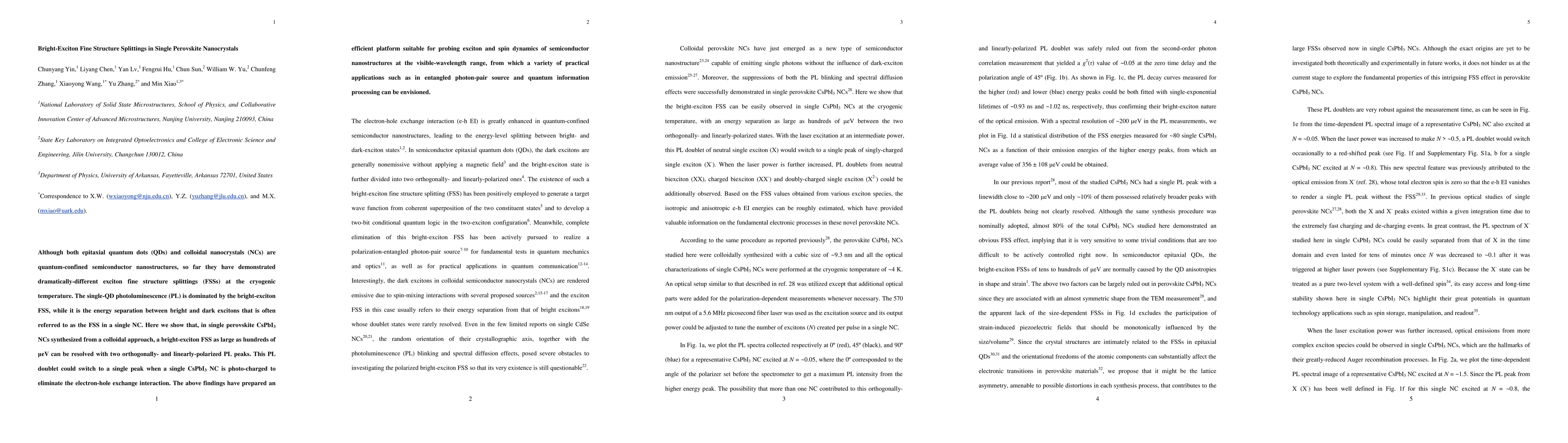 This paper investigates the bright-exciton fine structure splittings in single perovskite CsPbI3 nanocrystals, revealing a large FSS with distinct polarized photoluminescence peaks. The study demonstrates that the FSS can be manipulated by photo-charging, paving the way for applications in quantum information and entangled photon-pair sources.