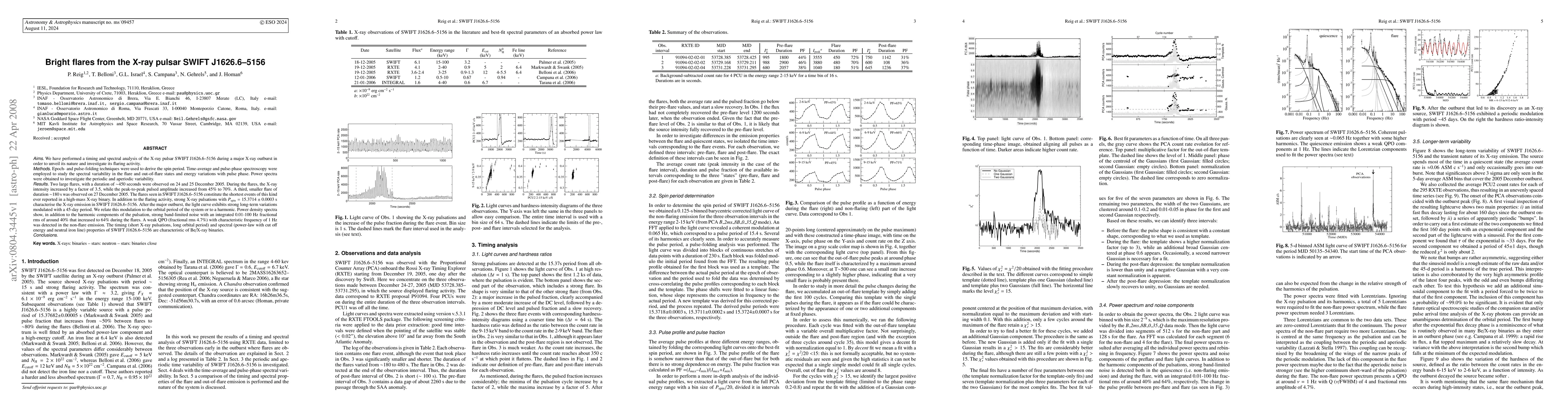 This study analyzes the X-ray pulsar SWIFT J1626.6-5156 during a major outburst, revealing two short flares and strong X-ray pulsations with a period of 15.3714 seconds. The flares exhibit significant intensity and pulsed amplitude increases, marking the shortest such events in a high-mass X-ray binary.