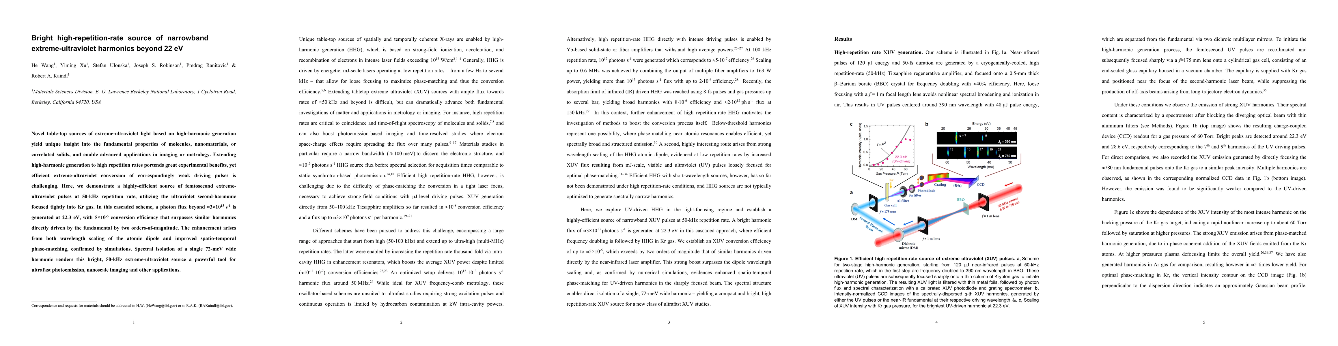 The research utilizes high-harmonic generation (HHG) in a Kr gas cell driven by femtosecond UV pulses at 50 kHz repetition rate, achieved through second-harmonic generation of near-IR pulses from a Ti:sapphire amplifier.