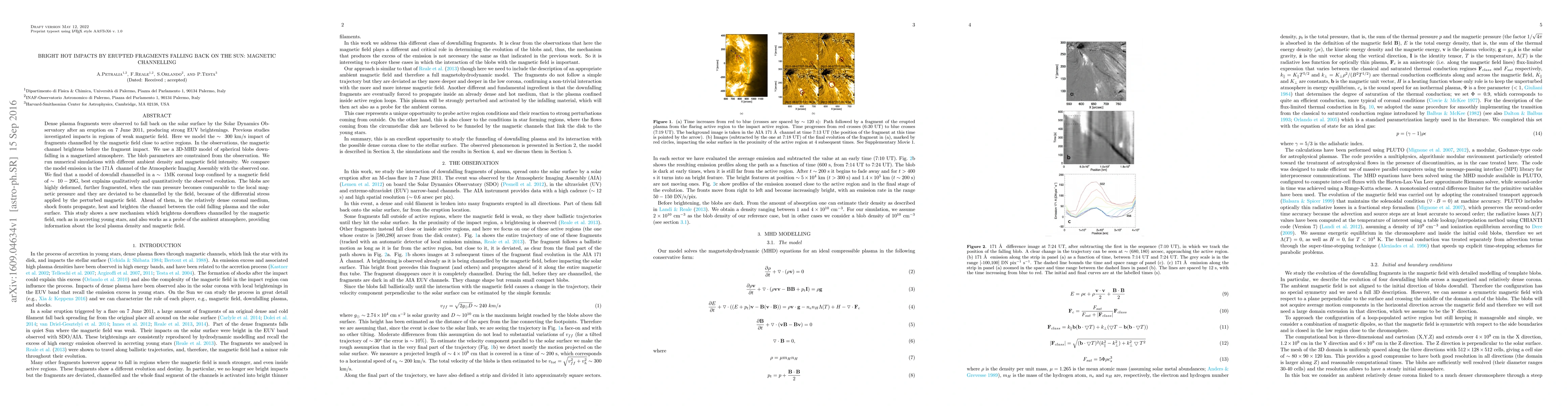 Dense plasma fragments were observed to fall back on the solar surface by the Solar Dynamics Observatory after an eruption on 7 June 2011, producing strong EUV brightenings. Previous studies investigated impacts in regions of weak magnetic field. Here we model the $\sim~300$ km/s impact of fragments channelled by the magnetic field close to active regions. In the observations, the magnetic channel brightens before the fragment impact. We use a 3D-MHD model of spherical blobs downfalling in a magnetized atmosphere. The blob parameters are constrained from the observation. We run numerical simulations with different ambient density and magnetic field intensity. We compare the model emission in the 171\AA~ channel of the Atmospheric Imaging Assembly with the observed one. We find that a model of downfall channelled in a $\sim~1$MK coronal loop confined by a magnetic field of $\sim~10-20$G, best explains qualitatively and quantitatively the observed evolution. The blobs are highly deformed, further fragmented, when the ram pressure becomes comparable to the local magnetic pressure and they are deviated to be channelled by the field, because of the differential stress applied by the perturbed magnetic field. Ahead of them, in the relatively dense coronal medium, shock fronts propagate, heat and brighten the channel between the cold falling plasma and the solar surface. This study shows a new mechanism which brightens downflows channelled by the magnetic field, such as in accreting young stars, and also works as a probe of the ambient atmosphere, providing information about the local plasma density and magnetic field.
