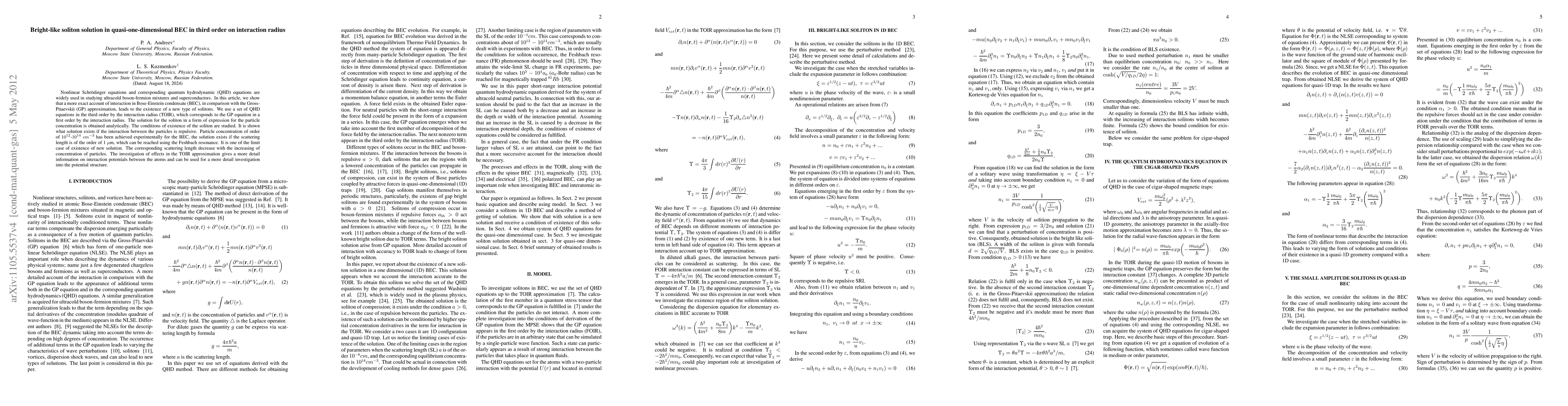 Nonlinear Schr\"{o}dinger equations and corresponding quantum hydrodynamic (QHD) equations are widely used in studying ultracold boson-fermion mixtures and superconductors. In this article, we show that a more exact account of interaction in Bose-Einstein condensate (BEC), in comparison with the Gross-Pitaevskii (GP) approximation, leads to the existence of a new type of solitons. We use a set of QHD equations in the third order by the interaction radius (TOIR), which corresponds to the GP equation in a first order by the interaction radius. The solution for the soliton in a form of expression for the particle concentration is obtained analytically. The conditions of existence of the soliton are studied. It is shown what solution exists if the interaction between the particles is repulsive. Particle concentration of order of $10^{12}$-$10^{14}$ $cm^{-3}$ has been achieved experimentally for the BEC, the solution exists if the scattering length is of the order of 1 $\mu$m, which can be reached using the Feshbach resonance. It is one of the limit case of existence of new solution. The corresponding scattering length decrease with the increasing of concentration of particles. The investigation of effects in the TOIR approximation gives a more detail information on interaction potentials between the atoms and can be used for a more detail investigation into the potential structure.