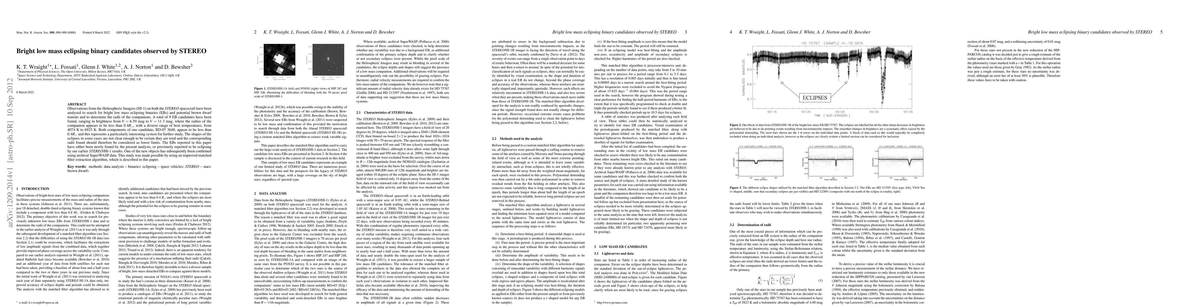 Observations from the Heliospheric Imagers (HI-1) on both the STEREO spacecraft have been analysed to search for bright low mass eclipsing binaries (EBs) and potential brown dwarf transits and to determine the radii of the companions. A total of 9 EB candidates have been found, ranging in brightness from V=6.59 mag to V=11.3 mag, where the radius of the companion appears to be less than 0.4 Rsol, with a diverse range of host temperatures, from 4074 K to 6925 K. Both components of one candidate, BD-07 3648, appear to be less than 0.4 Rsol and this represents a particularly interesting system for further study. The shapes of the eclipses in some cases are not clear enough to be certain they are total and the corresponding radii found should therefore be considered as lower limits. The EBs reported in this paper have either been newly found by the present analysis, or previously reported to be eclipsing by our earlier STEREO/HI-1 results. One of the new objects has subsequently been confirmed using archival SuperWASP data. This study was made possible by using an improved matched filter extraction algorithm, which is described in this paper.