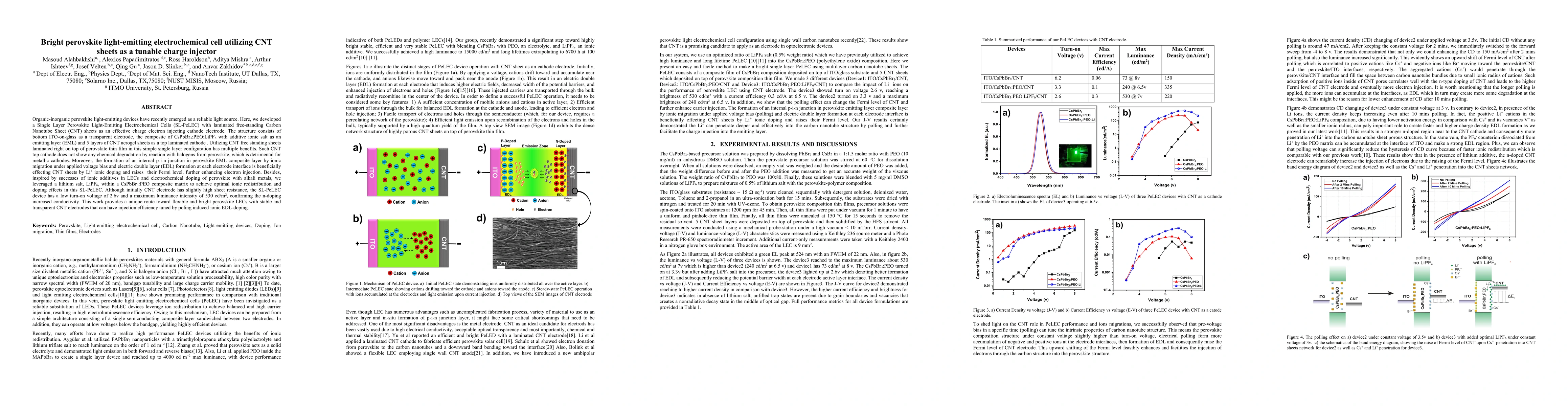 This paper presents a Single Layer Perovskite Light-Emitting Electrochemical Cell (SL-PeLEC) utilizing Carbon Nanotube (CNT) sheets as a tunable charge injector, achieving a low turn-on voltage and high luminance intensity while maintaining stability and flexibility. The CNT cathode enhances electron injection through ionic doping and avoids chemical degradation.
