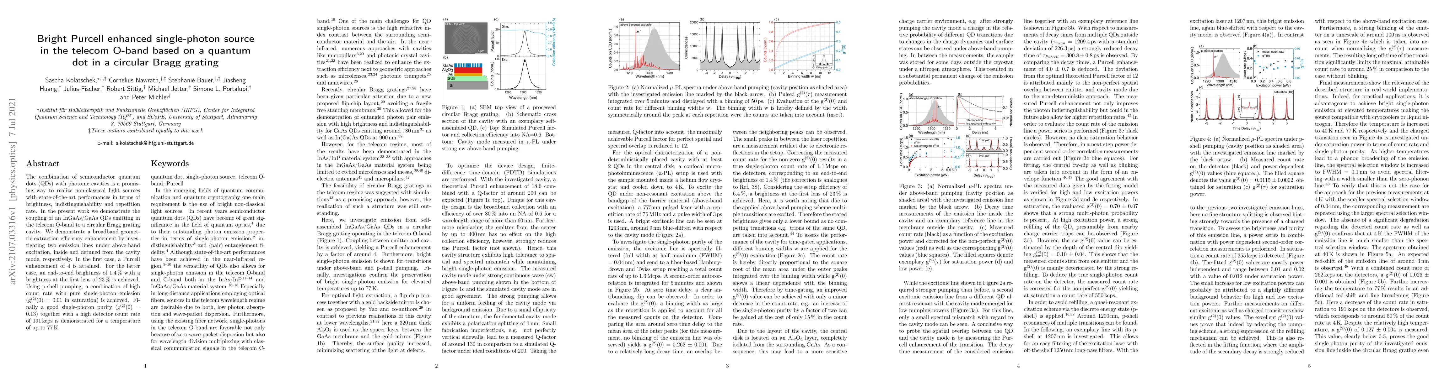 This paper demonstrates a bright single-photon source in the telecom O-band using an InGaAs/GaAs quantum dot coupled to a circular Bragg grating cavity, achieving a Purcell enhancement of 4 and a high geometric extraction efficiency. The source exhibits high purity and a high count rate up to 77K.