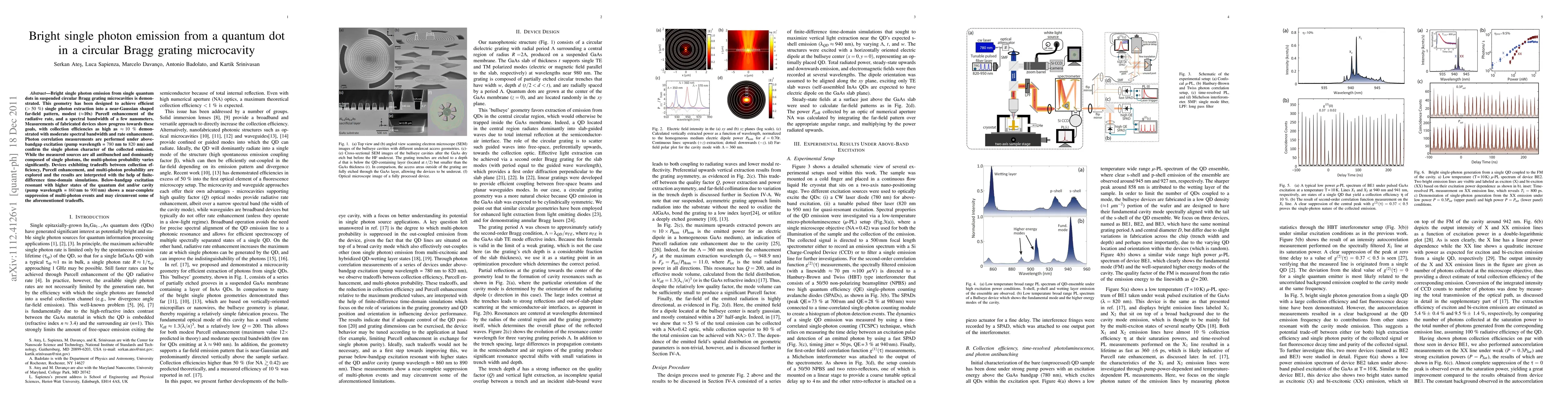 This paper demonstrates bright single photon emission from quantum dots in circular Bragg grating microcavities, achieving efficient photon extraction and modest Purcell enhancement. The study explores tradeoffs between collection efficiency, enhancement, and multi-photon probability, suggesting below-bandgap excitation may suppress multi-photon events.