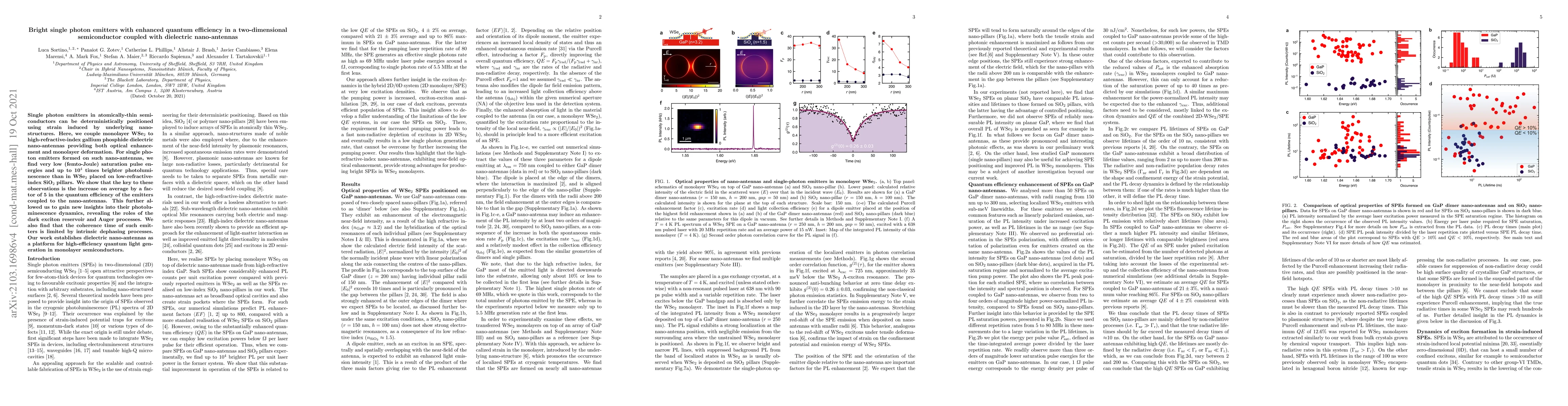 This paper demonstrates the enhancement of quantum efficiency and brightness in single photon emitters in monolayer WSe$_2$ when coupled with gallium phosphide dielectric nano-antennas, leading to up to 10$^4$ times brighter photoluminescence and femto-Joule saturation pulse energies. The study reveals increased quantum efficiency by a factor of 5 and provides insights into the dynamics of photoluminescence and coherence time.