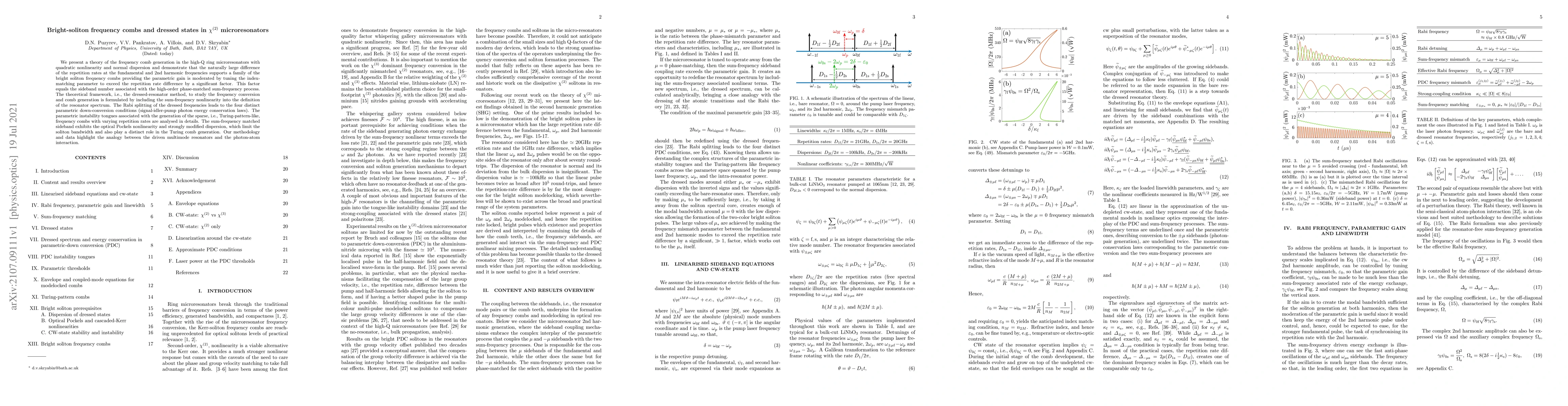 We present a theory of the frequency comb generation in the high-Q ring microresonators with quadratic nonlinearity and normal dispersion and demonstrate that the naturally large difference of the repetition rates at the fundamental and 2nd harmonic frequencies supports a family of the bright soliton frequency combs providing the parametric gain is moderated by tuning the index-matching parameter to exceed the repetition rate difference by a significant factor. This factor equals the sideband number associated with the high-order phase-matched sum-frequency process. The theoretical framework, i.e., the dressed-resonator method, to study the frequency conversion and comb generation is formulated by including the sum-frequency nonlinearity into the definition of the resonator spectrum. The Rabi splitting of the dressed frequencies leads to the four distinct parametric down-conversion conditions (signal-idler-pump photon energy conservation laws). The parametric instability tongues associated with the generation of the sparse, i.e., Turing-pattern-like, frequency combs with varying repetition rates are analysed in details. The sum-frequency matched sideband exhibits the optical Pockels nonlinearity and strongly modified dispersion, which limit the soliton bandwidth and also play a distinct role in the Turing comb generation. Our methodology and data highlight the analogy between the driven multimode resonators and the photon-atom interaction.