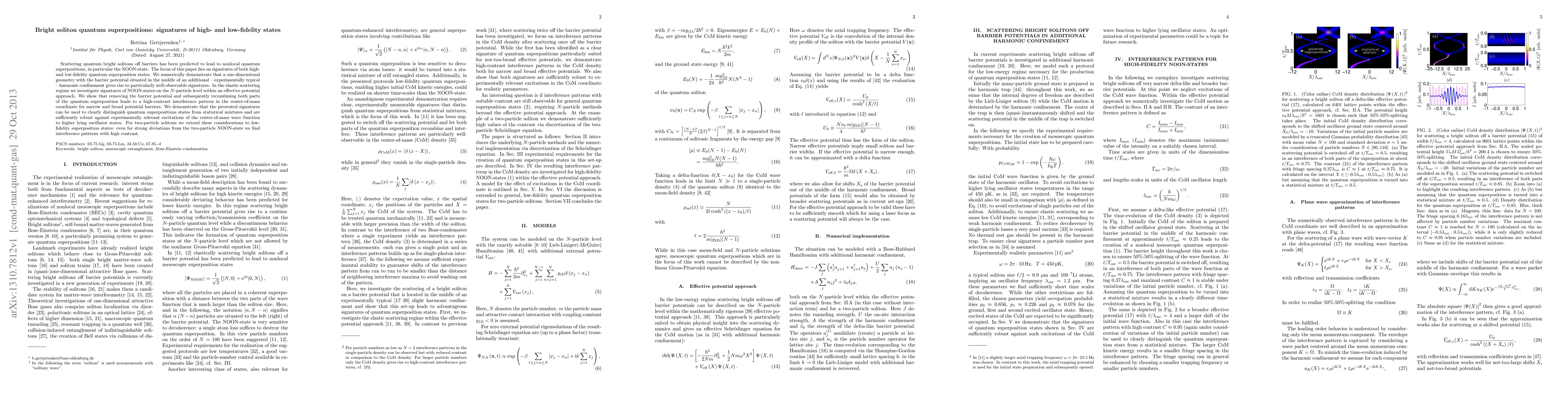 This paper investigates the signatures of high- and low-fidelity quantum superposition states arising from scattering bright solitons off barriers, demonstrating robust interference patterns in one-dimensional geometries. The study shows that these patterns can distinguish quantum superpositions from statistical mixtures, even under experimental perturbations.