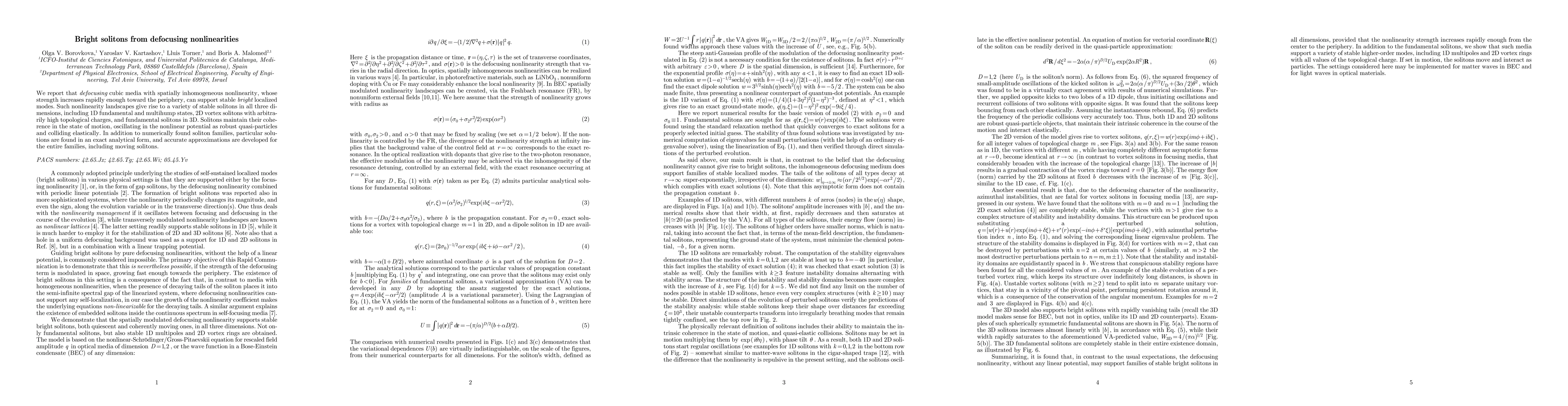 This paper demonstrates that defocusing nonlinear media with spatially varying nonlinearity can support stable bright solitons in three dimensions, including fundamental, multihump, vortex, and 3D solitons, which maintain coherence and collide elastically. Analytical solutions and approximations for these solitons are also provided.