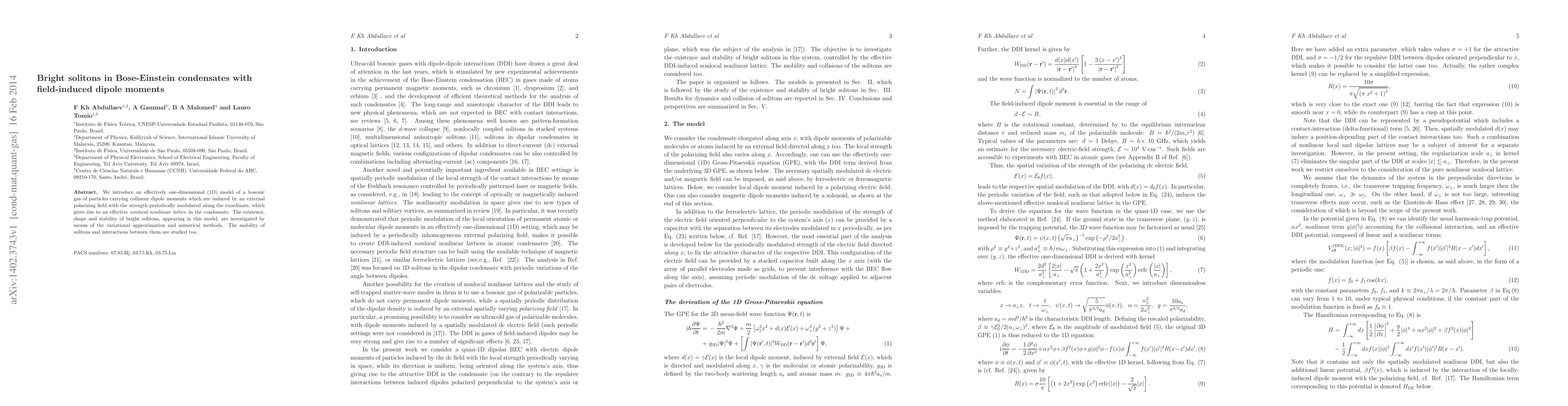 This research investigates bright solitons in 1D Bose-Einstein condensates with field-induced dipole moments, using variational approximation and numerical methods. It explores soliton existence, shape, stability, mobility, and interactions, revealing an effective nonlocal nonlinear lattice in the condensate due to a periodically modulated external polarizing field.