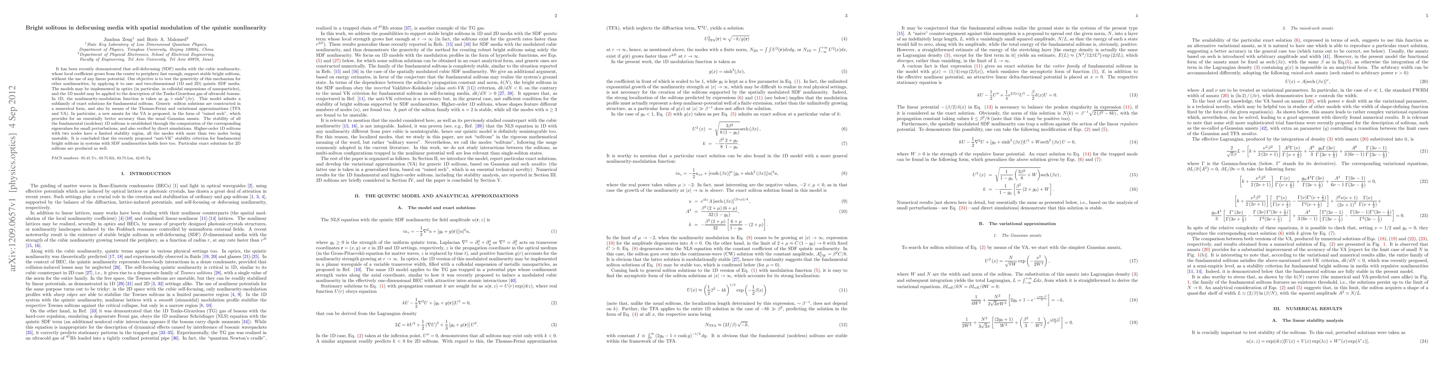 This paper explores the stability of bright solitons in defocusing media with spatially modulated quintic nonlinearity, demonstrating that such solitons can exist without linear potentials. The study confirms the stability of fundamental solitons in 1D and 2D models, proposing a new variational ansatz for better accuracy and verifying the "anti-VK" stability criterion.
