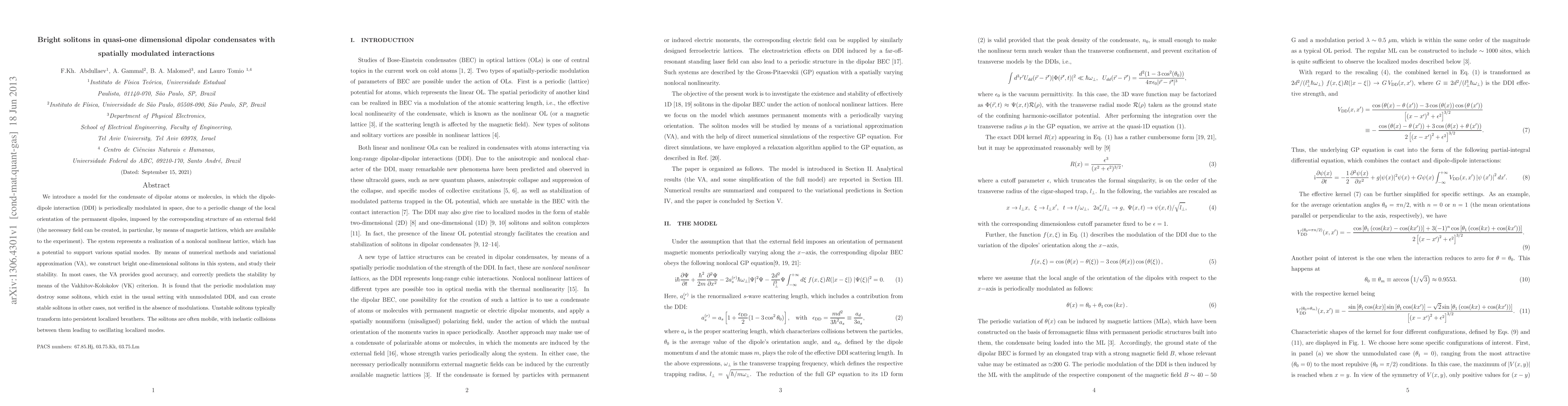 We introduce a model for the condensate of dipolar atoms or molecules, in which the dipole-dipole interaction (DDI) is periodically modulated in space, due to a periodic change of the local orientation of the permanent dipoles, imposed by the corresponding structure of an external field (the necessary field can be created, in particular, by means of magnetic lattices, which are available to the experiment). The system represents a realization of a nonlocal nonlinear lattice, which has a potential to support various spatial modes. By means of numerical methods and variational approximation (VA), we construct bright one-dimensional solitons in this system, and study their stability. In most cases, the VA provides good accuracy, and correctly predicts the stability by means of the Vakhitov-Kolokolov (VK)\ criterion. It is found that the periodic modulation may destroy some solitons, which exist in the usual setting with unmodulated DDI, and can create stable solitons in other cases, not verified in the absence of modulations. Unstable solitons typically transform into persistent localized breathers. The solitons are often mobile, with inelastic collisions between them leading to oscillating localized modes.