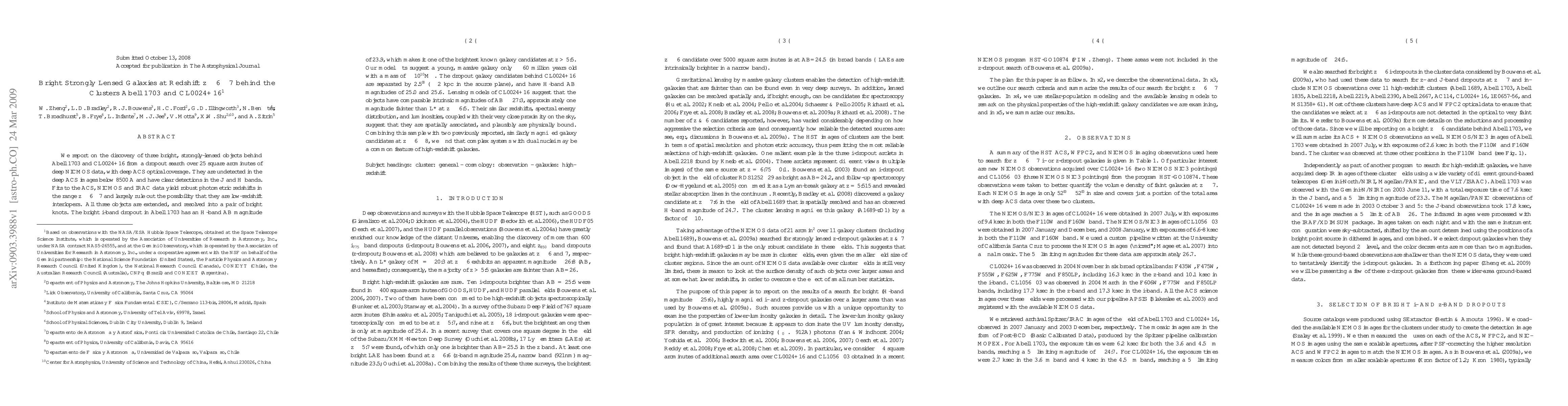 This paper reports the discovery of three bright, strongly lensed galaxies at redshifts z~6-7 behind clusters Abell 1703 and CL0024+16, identified through deep NICMOS and ACS data. These galaxies are among the brightest known at z>5.5, suggesting they are young, massive systems with dual nuclei, potentially common in high-redshift galaxies.