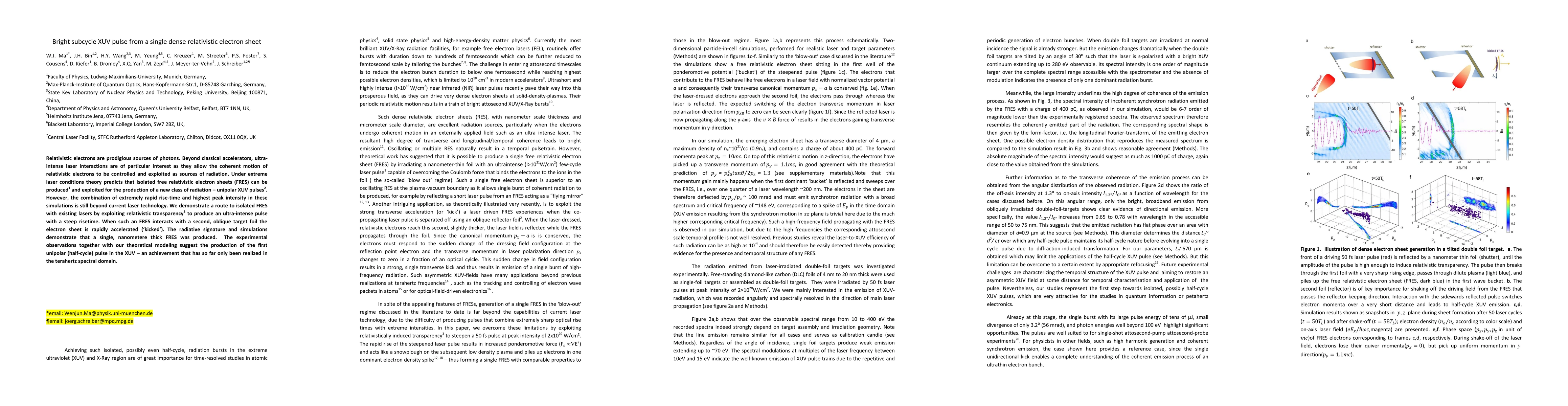 Relativistic electrons are prodigious sources of photons. Beyond classical accelerators, ultra-intense laser interactions are of particular interest as they allow the coherent motion of relativistic electrons to be controlled and exploited as sources of radiation. Under extreme laser conditions theory predicts that isolated free relativistic electron sheets (FRES) can be produced and exploited for the production of a new class of radiation - unipolar extreme ultraviolet(XUV) pulses. However, the combination of extremely rapid rise-time and highest peak intensity in these simulations is still beyond current laser technology. We demonstrate a route to isolated FRES with existing lasers by exploiting relativistic transparency to produce an ultra-intense pulse with a steep rise time. When such an FRES interacts with a second, oblique target foil the electron sheet is rapidly accelerated ('kicked'). The radiation signature and simulations demonstrate that a single, nanometer thick FRES was produced. The experimental observations together with our theoretical modeling suggest the production of the first unipolar (half-cycle) pulse in the XUV - an achievement that has so far only been realized in the terahertz spectral domain.