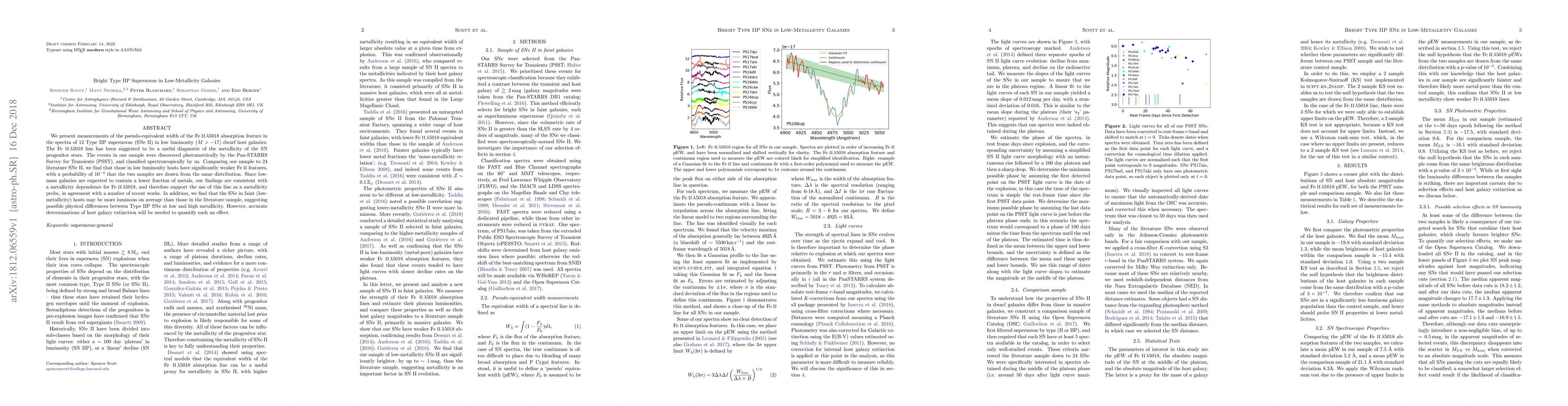 We present measurements of the pseudo-equivalent width of the Fe II,$\lambda$5018 absorption feature in the spectra of 12 Type IIP supernovae (SNe II) in low luminosity ($M>-17$) dwarf host galaxies. The Fe II,$\lambda$5018 line has been suggested to be a useful diagnostic of the metallicity of the SN progenitor stars. The events in our sample were discovered photometrically by the Pan-STARRS Survey for Transients (PSST), and classified spectroscopically by us. Comparing our sample to 24 literature SNe II, we find that those in low luminosity hosts have significantly weaker Fe II features, with a probability of $10^{-4}$ that the two samples are drawn from the same distribution. Since low-mass galaxies are expected to contain a lower fraction of metals, our findings are consistent with a metallicity dependence for Fe II,$\lambda$5018, and therefore support the use of this line as a metallicity probe, in agreement with a number of recent works. In addition, we find that the SNe in faint (low-metallicity) hosts may be more luminous on average than those in the literature sample, suggesting possible physical differences between Type IIP SNe at low and high metallicity. However, accurate determinations of host galaxy extinction will be needed to quantify such an effect.