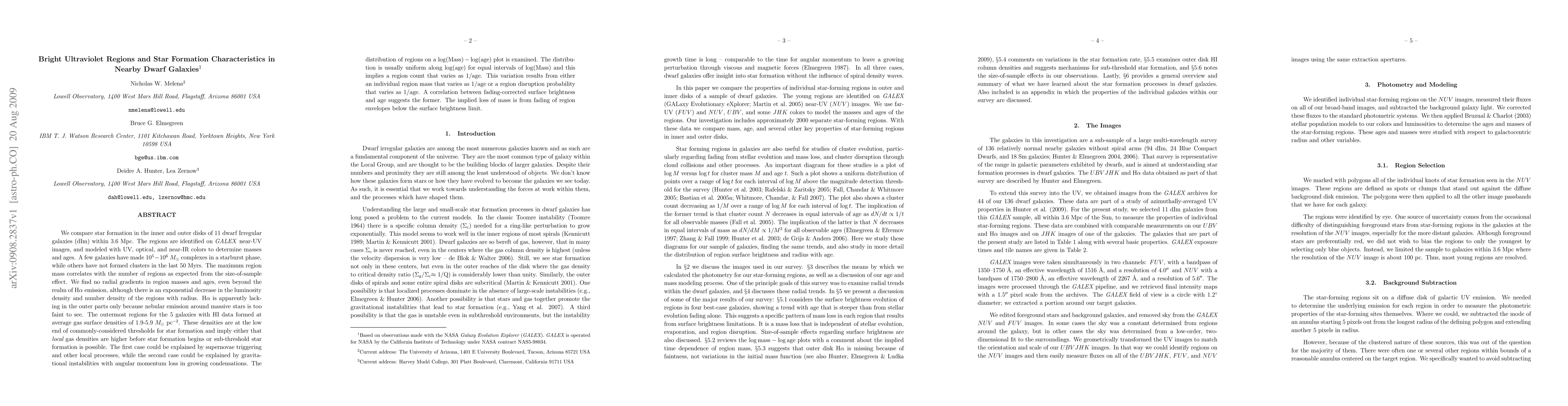We compare star formation in the inner and outer disks of 11 dwarf Irregular galaxies (dIm) within 3.6 Mpc. The regions are identified on GALEX near-UV images, and modeled with UV, optical, and near-IR colors to determine masses and ages. A few galaxies have made 10^5-10^6 Msun complexes in a starburst phase, while others have not formed clusters in the last 50 Myrs. The maximum region mass correlates with the number of regions as expected from the size-of-sample effect. We find no radial gradients in region masses and ages, even beyond the realm of Halpha emission, although there is an exponential decrease in the luminosity density and number density of the regions with radius. Halpha is apparently lacking in the outer parts only because nebular emission around massive stars is too faint to see. The outermost regions for the 5 galaxies with HI data formed at average gas surface densities of 1.9-5.9 Msun/pc2. These low average densities imply either that local gas densities are high or sub-threshold star formation is possible. The distribution of regions on a log Mass - log age plot is is usually uniform along log age for equal intervals of log Mass. This uniformity results from either an individual region mass that varies as 1/age or a region disruption probability that varies as 1/age. A correlation between fading-corrected surface brightness and age suggests the former.