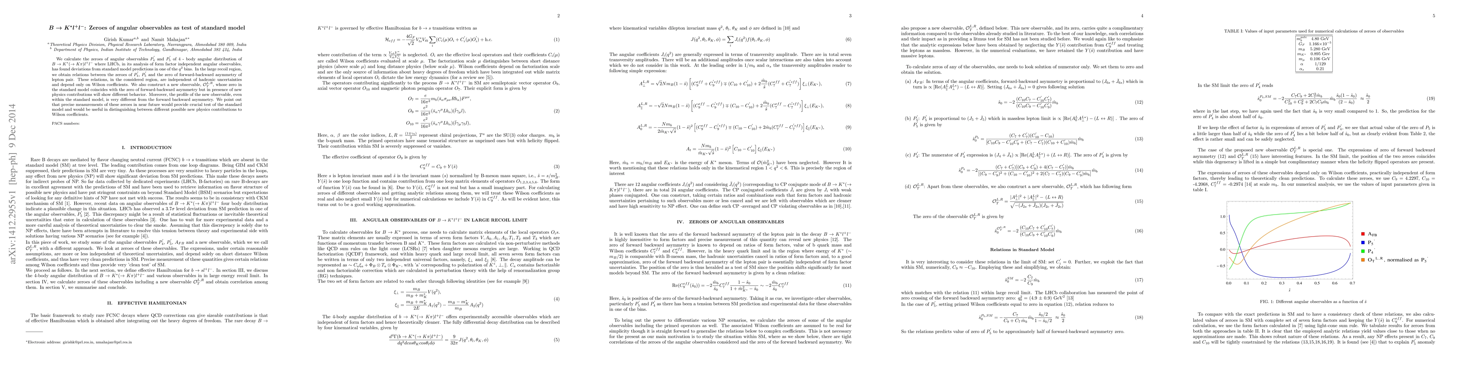 We calculate the zeroes of angular observables $P_4^{'}$ and $P_5^{'}$ of 4 - body angular distribution of $B\rightarrow K^{*} (\rightarrow K \pi) l^+ l^-$ where LHCb, in its analysis of form factor independent angular observables, has found deviations from standard model predictions in one of the $q^2$ bins. In the large recoil region, we obtain relations between the zeroes of $P_4^{'}$, $P_5^{'}$ and the zero of forward-backward asymmetry of lepton pair. These relations, in the considered region, are independent of hadronic uncertainties and depend only on Wilson coefficients. We also construct a new observable, $\mathcal{O}_T^{L,R}$, whose zero in the standard model coincides with the zero of forward-backward asymmetry but in presence of new physics contributions will show different behavior. Moreover, the profile of the new observable, even within the standard model, is very different from the forward backward asymmetry. We point out that precise measurements of these zeroes in near future would provide crucial test of the standard model and would be useful in distinguishing between different possible new physics contributions to Wilson coefficients.