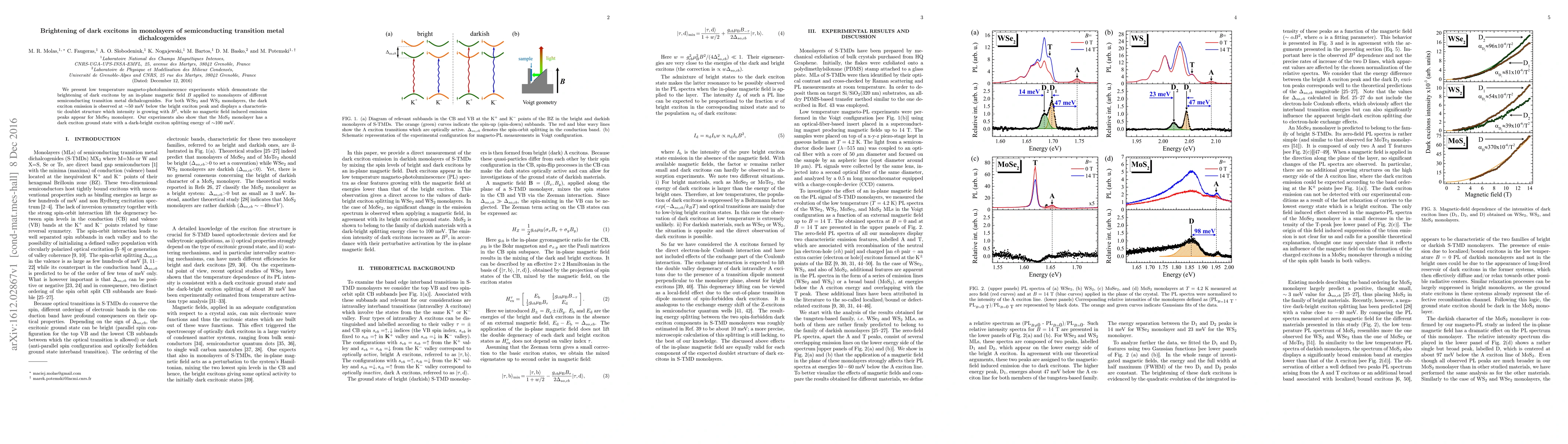 Low-temperature magneto-photoluminescence experiments reveal that dark excitons in WSe$_2$ and WS$_2$ monolayers brighten under an in-plane magnetic field, with their intensity increasing proportional to $B^2$. In contrast, MoSe$_2$ does not exhibit magnetic field-induced dark exciton emission, while MoS$_2$ has a dark exciton ground state with a significant dark-bright exciton splitting.