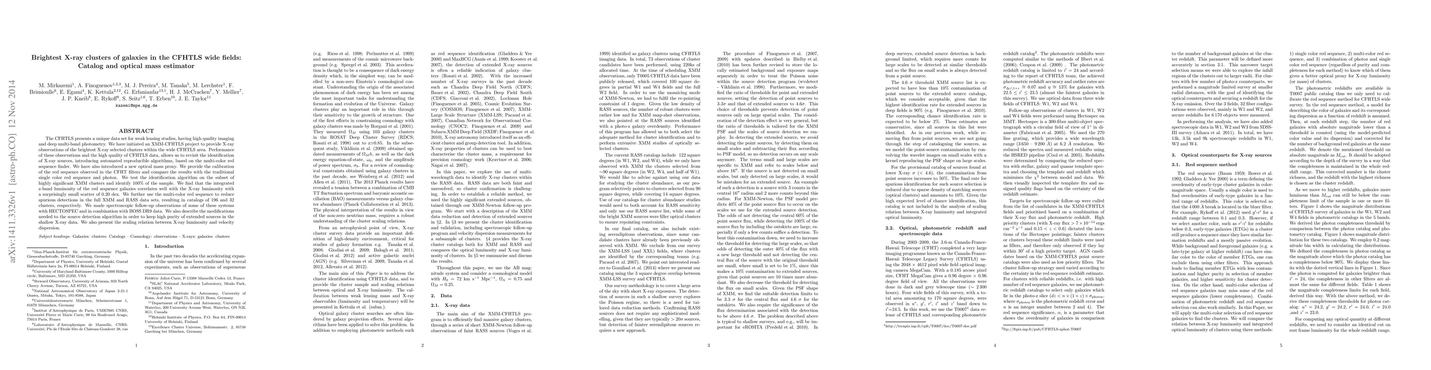 This paper presents an XMM-CFHTLS project cataloging the brightest X-ray clusters within the CFHTLS wide fields, utilizing high-quality imaging and multi-band photometry. It introduces an automated algorithm for X-ray source identification and a new optical mass proxy, finding a small 0.20 dex scatter in the correlation between red sequence luminosity and X-ray luminosity.