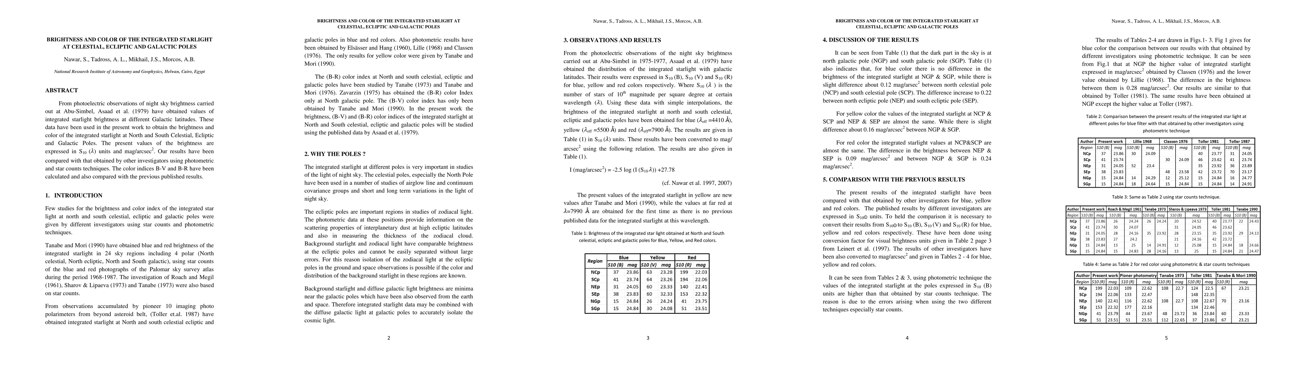 This study uses photoelectric observations from Abu-Simbel to determine the brightness and color of integrated starlight at celestial, ecliptic, and galactic poles, expressed in S10 units and mag/arcsec². Comparisons with other photometric and star count methods reveal consistent B-V and B-R color indices.