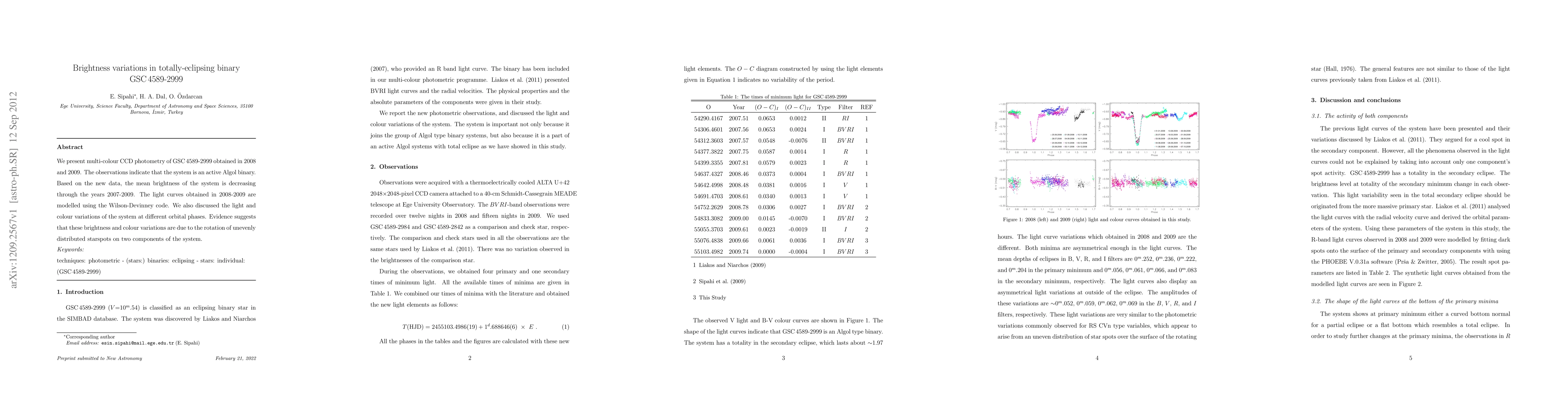 We present multi-colour CCD photometry of GSC4589-2999 obtained in 2008 and 2009. The observations indicate that the system is an active Algol binary. Based on the new data, the mean brightness of the system is decreasing through the years 2007-2009. The light curves obtained in 2008-2009 are modelled using the Wilson-Devinney code. We also discussed the light and colour variations of the system at different orbital phases. Evidence suggests that these brightness and colour variations are due to the rotation of unevenly distributed starspots on two components of the system.