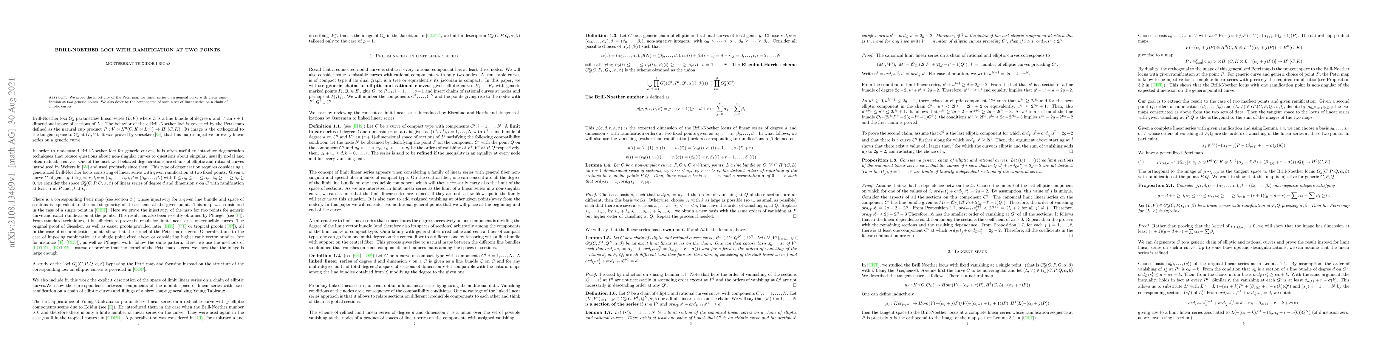 This paper proves the injectivity of the Petri map for linear series on a general curve with specific ramification at two generic points. Additionally, it explores the components of these linear series on a chain of elliptic curves.