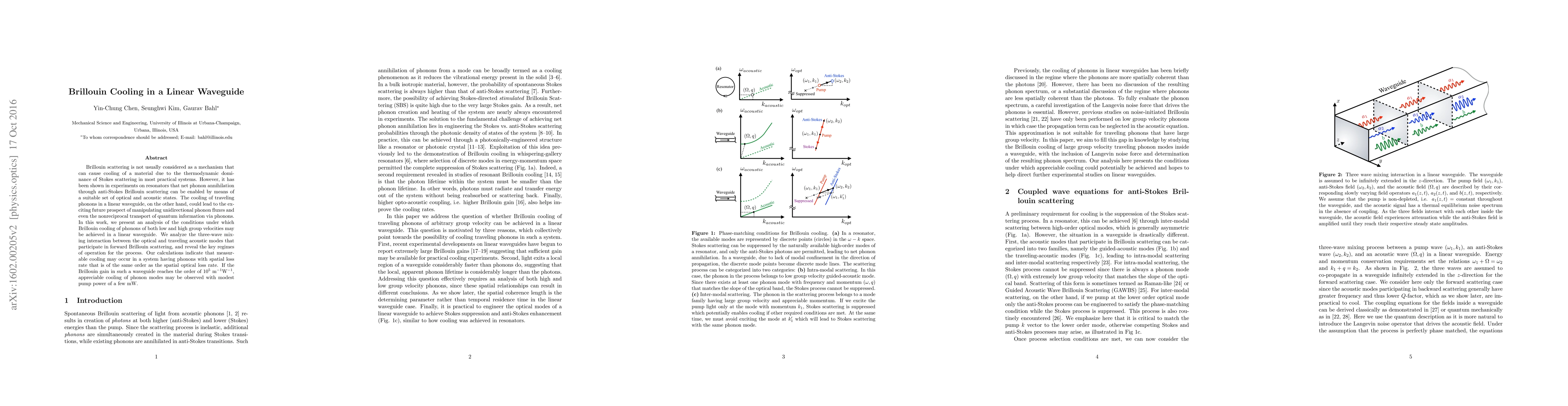 This research explores Brillouin cooling in linear waveguides, showing that net phonon annihilation via anti-Stokes scattering can enable cooling, even with the usual dominance of Stokes scattering. The study reveals conditions for achieving measurable phonon cooling with Brillouin gain on the order of 10$^{5}$ m$^{-1}$W$^{-1}$ and modest pump power.